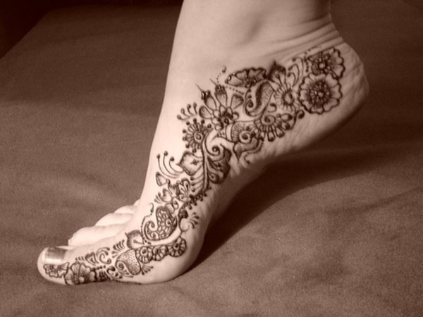 Description: A woman's feet with a hendike on it's feet and a tattoo on the bottom of her leg.