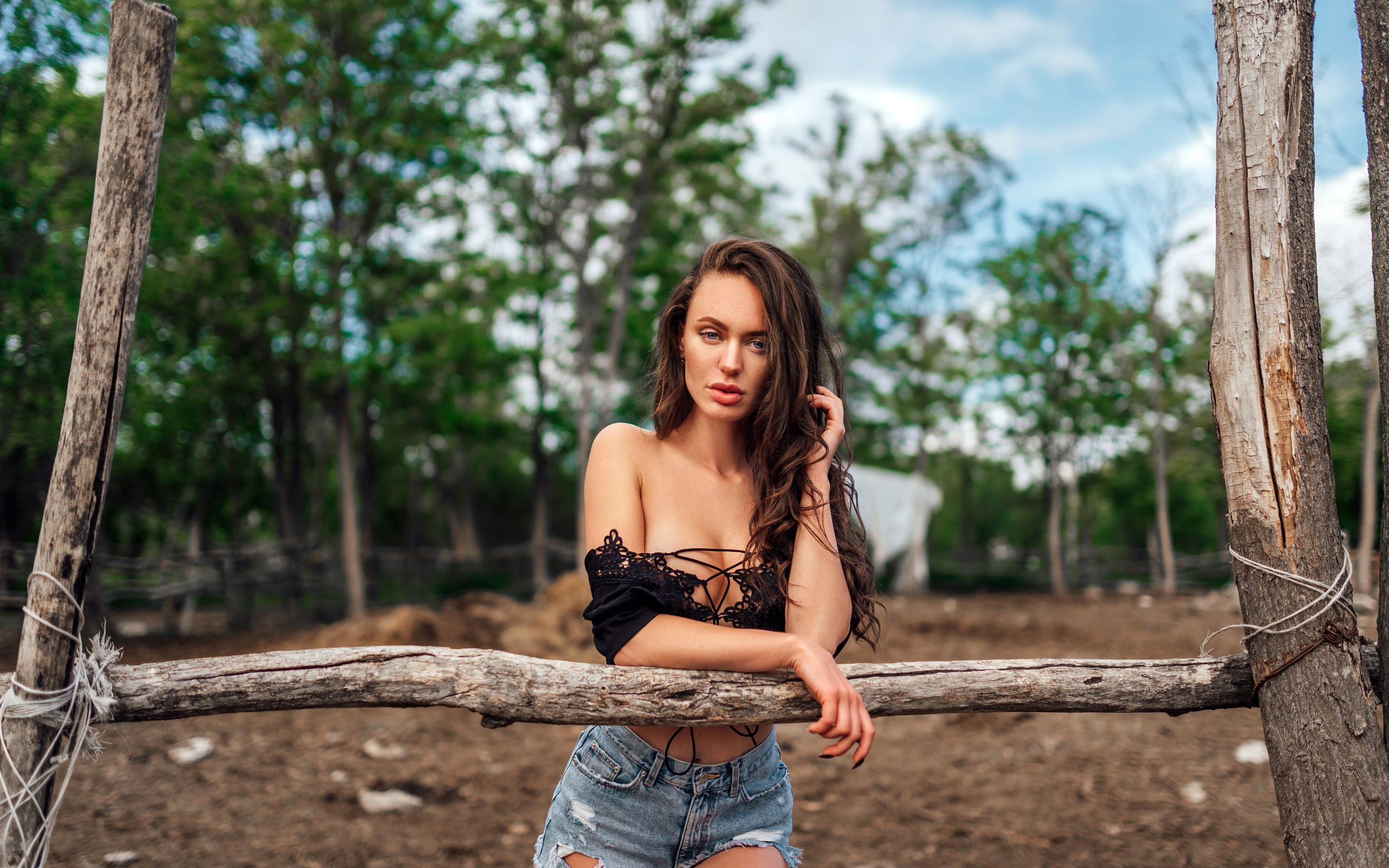 Description: A woman leaning on a wooden fence with her hand on her hip and looking at the camera with a serious look on her face.