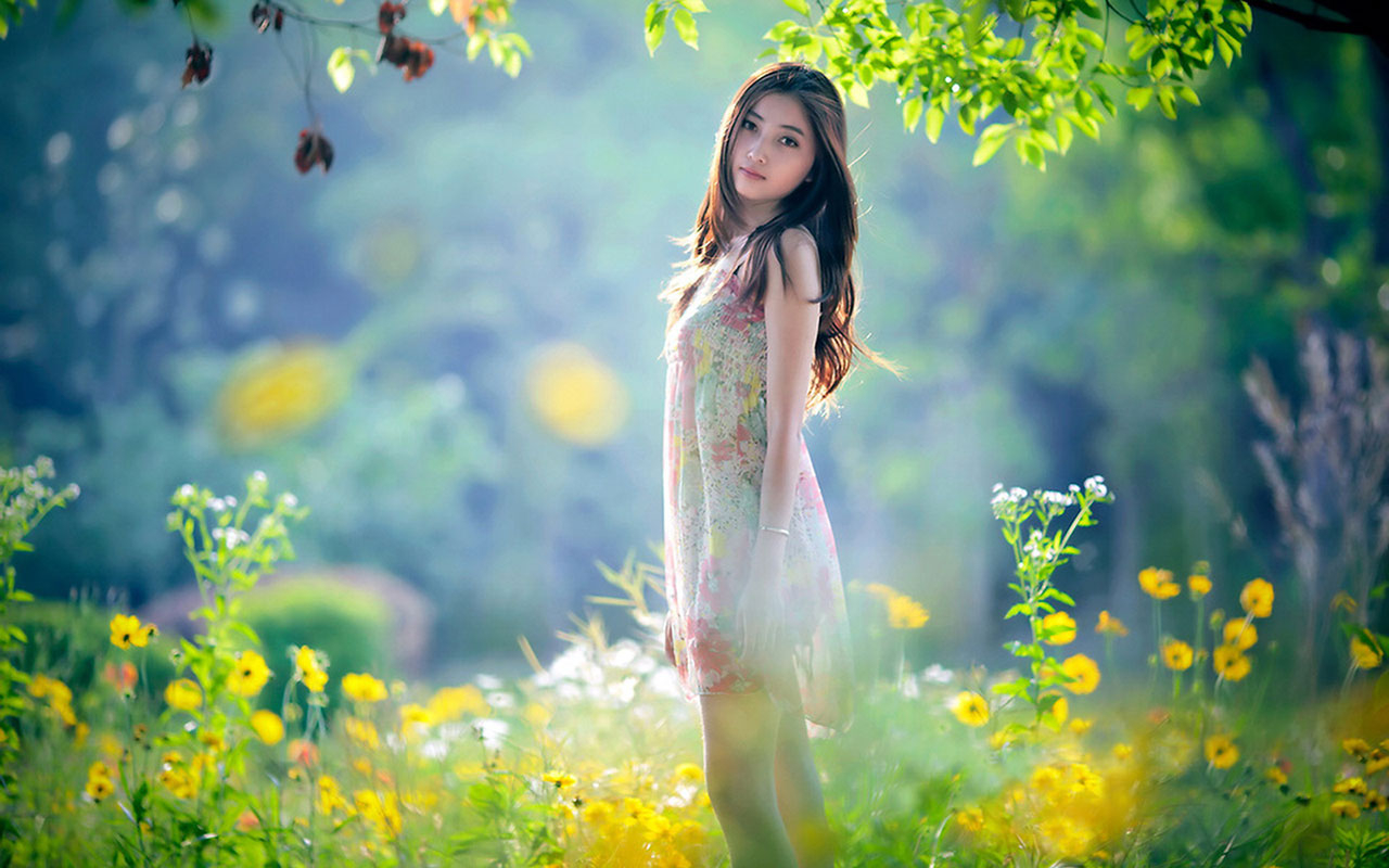 Description: A woman standing in a field of flowers with a tree in the background and sunlight shining through the leaves.