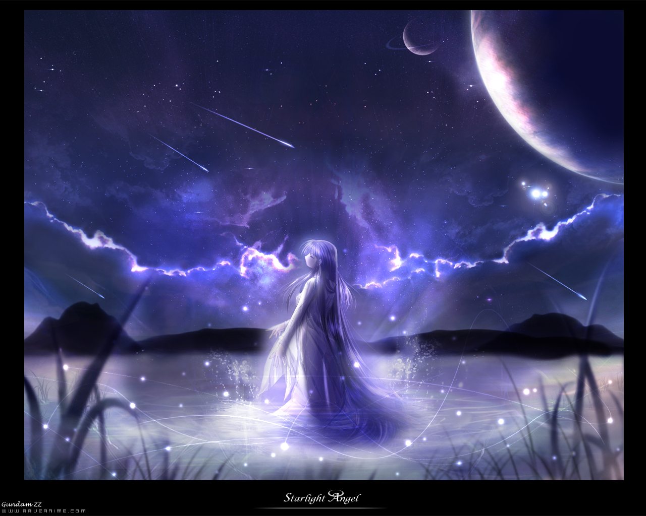 Description: A woman standing in a field with a sky background and stars in the sky above her.