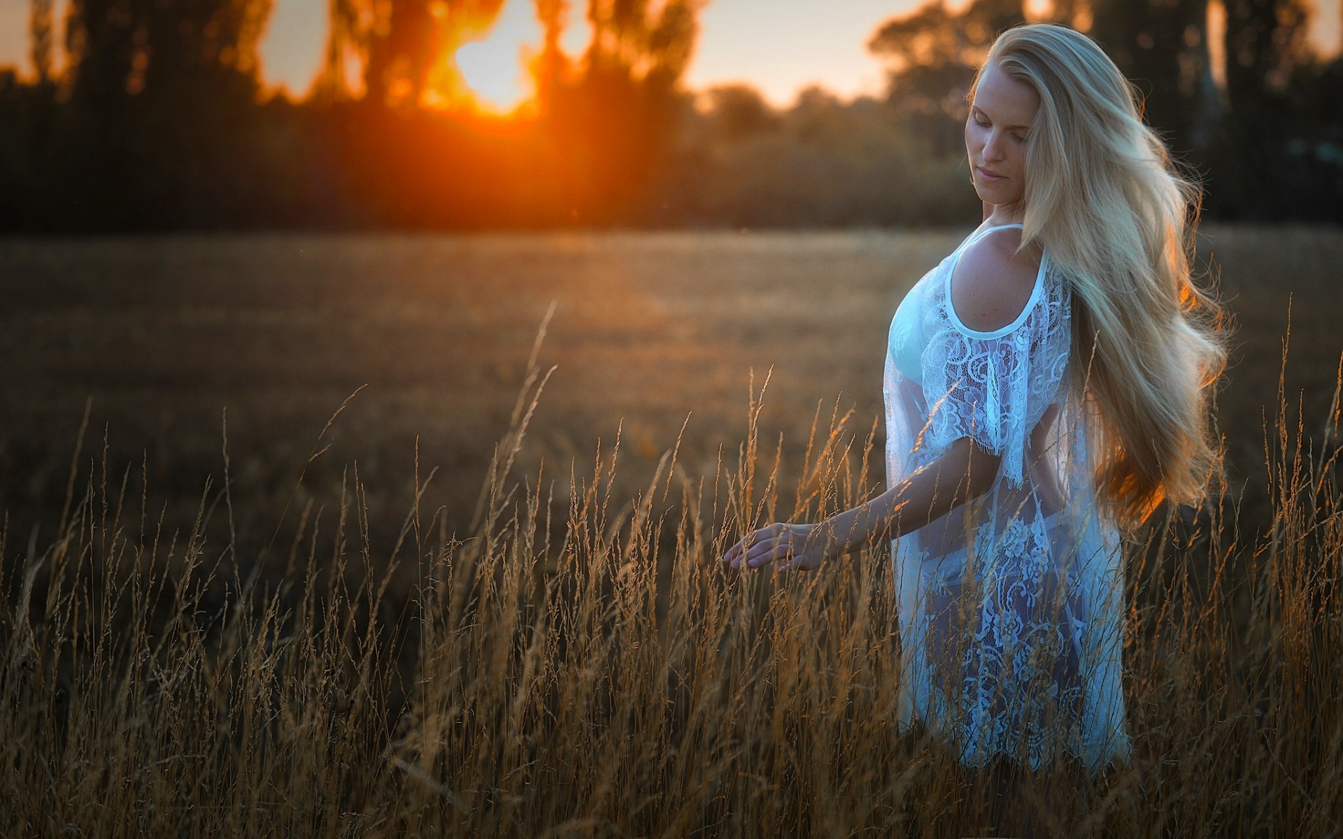 Description: A woman standing in a field of tall grass at sunset with her hair blowing in the wind and the sun setting behind her.