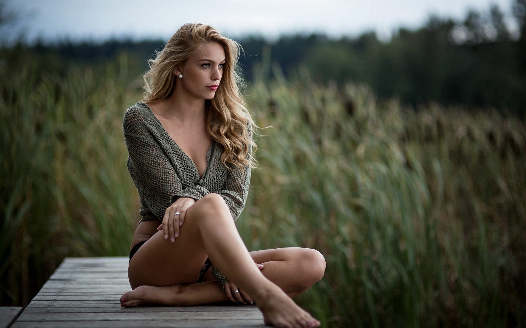 Description: A woman sitting on a wooden platform in a field of tall grass and tall grass behind her is a body of water.