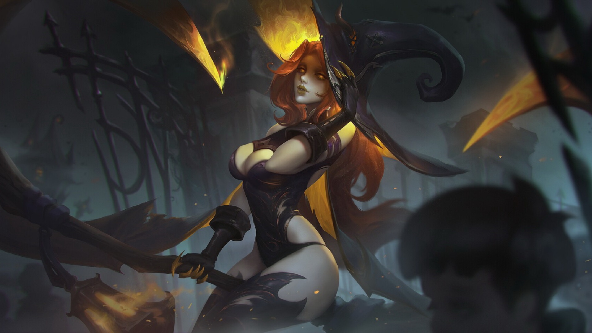 Description: A woman with a sword in a dark forest with flames on her chest and a demon on her back.