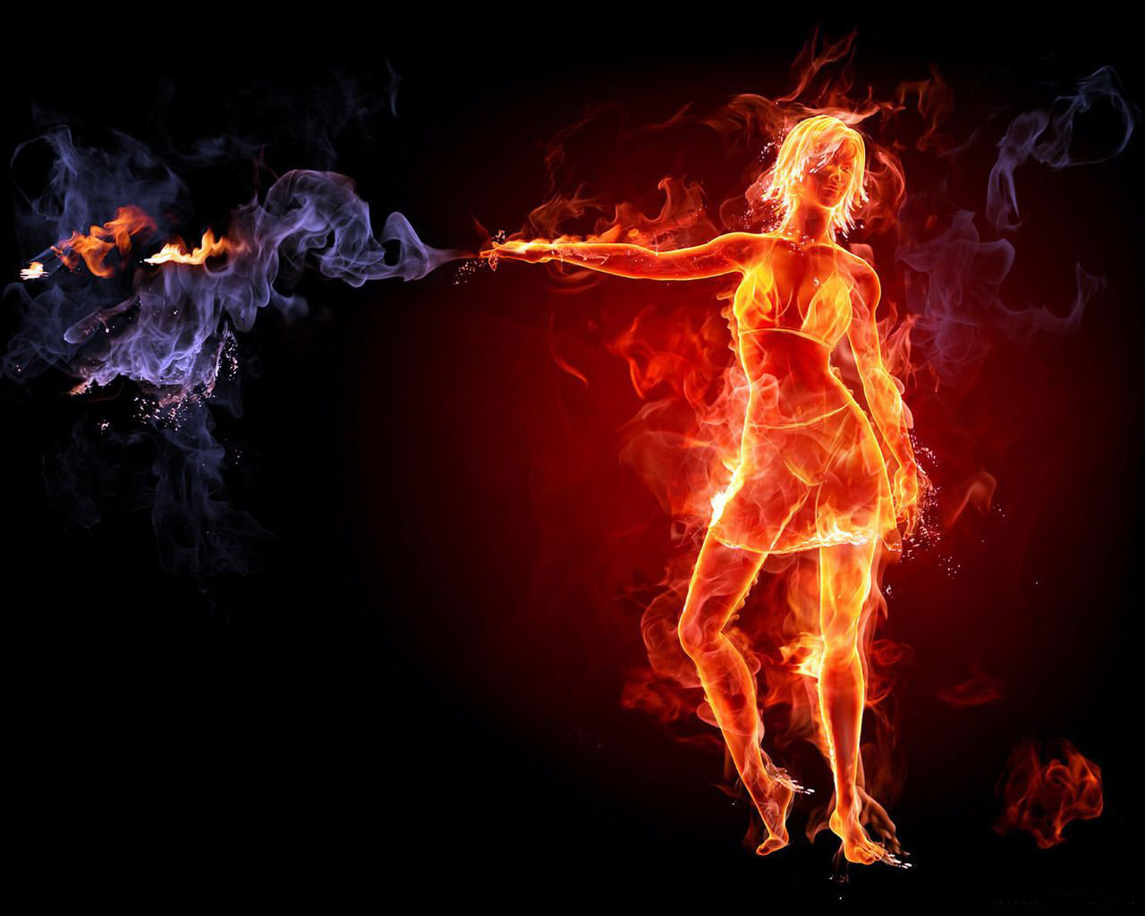 Description: A woman is shown in flames with a cigarette in her hand and a black background behind her is a red and blue flame.