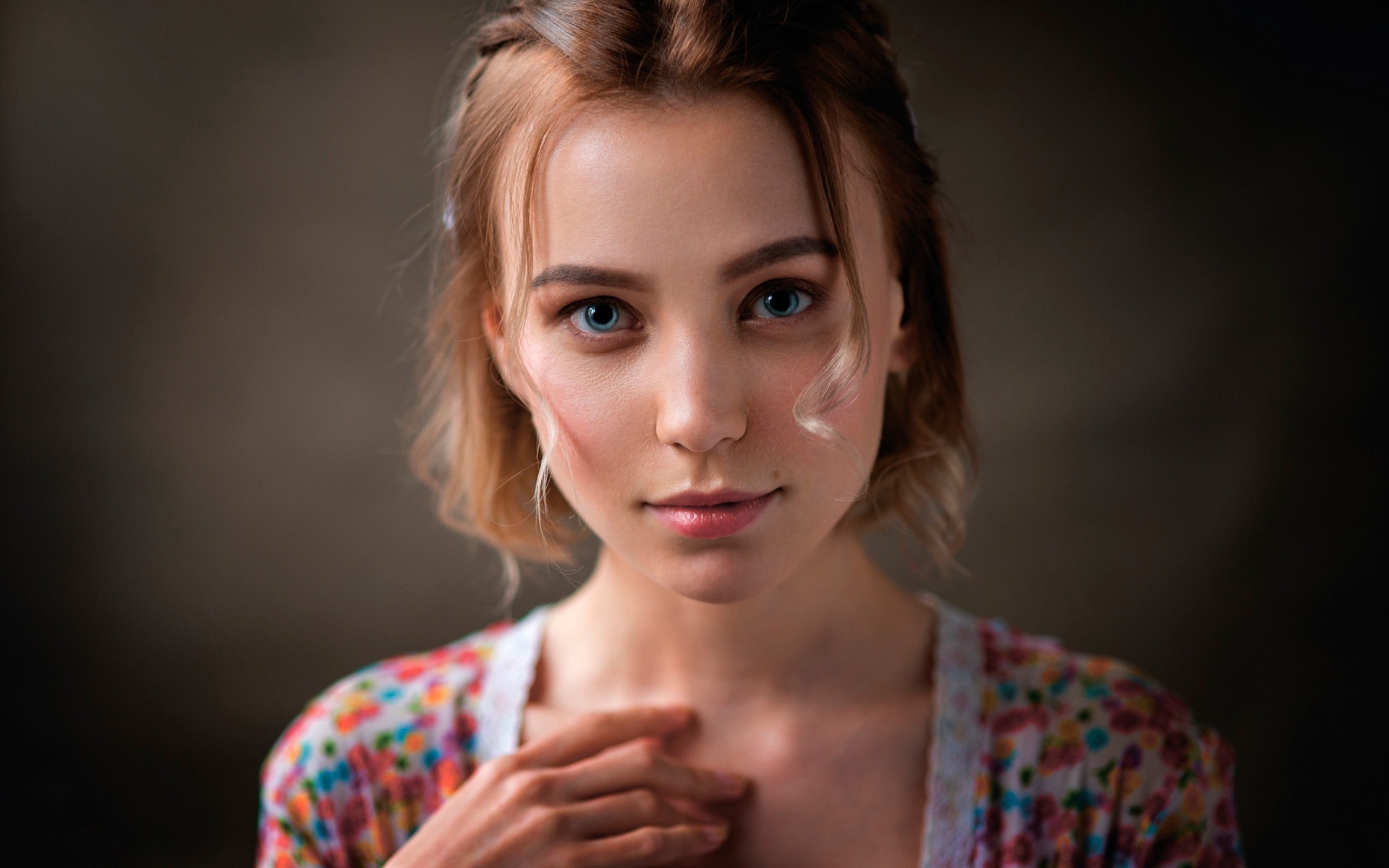 Description: A woman with a bun bun and a flowered dress is posing for a picture with her hands together.