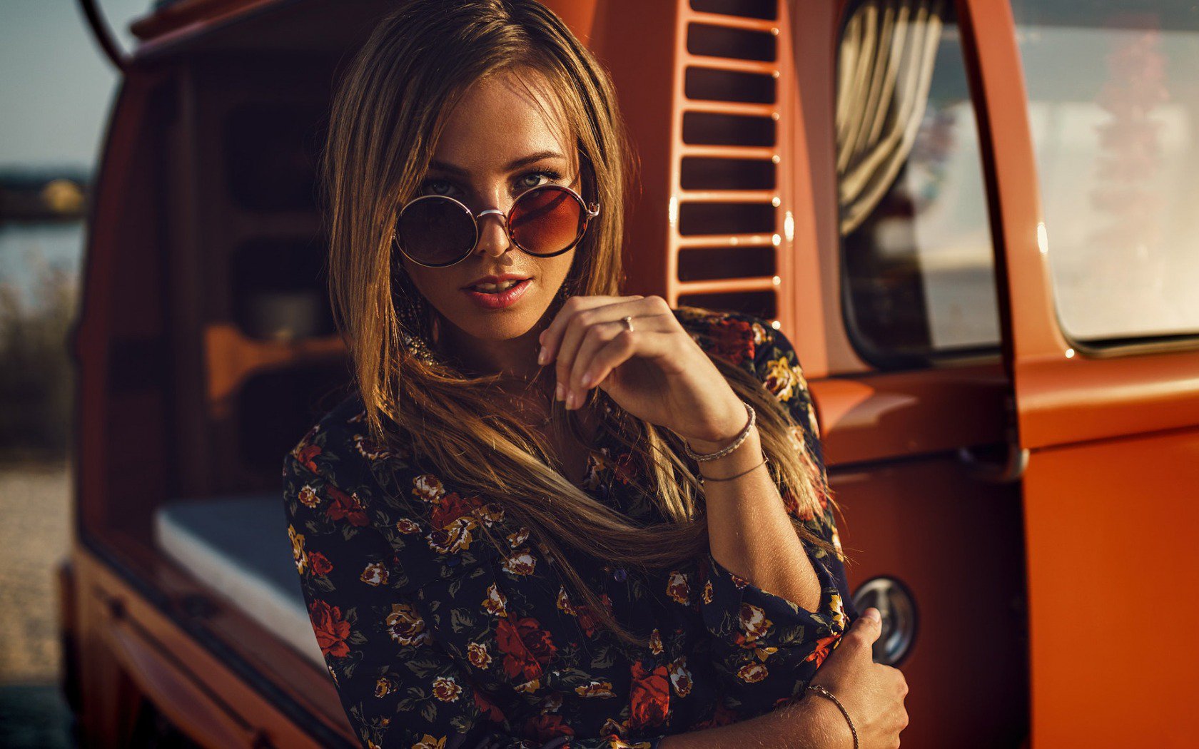 Description: A woman in a floral shirt and sunglasses leaning on a truck door handle with her arms crossed and looking at the camera.