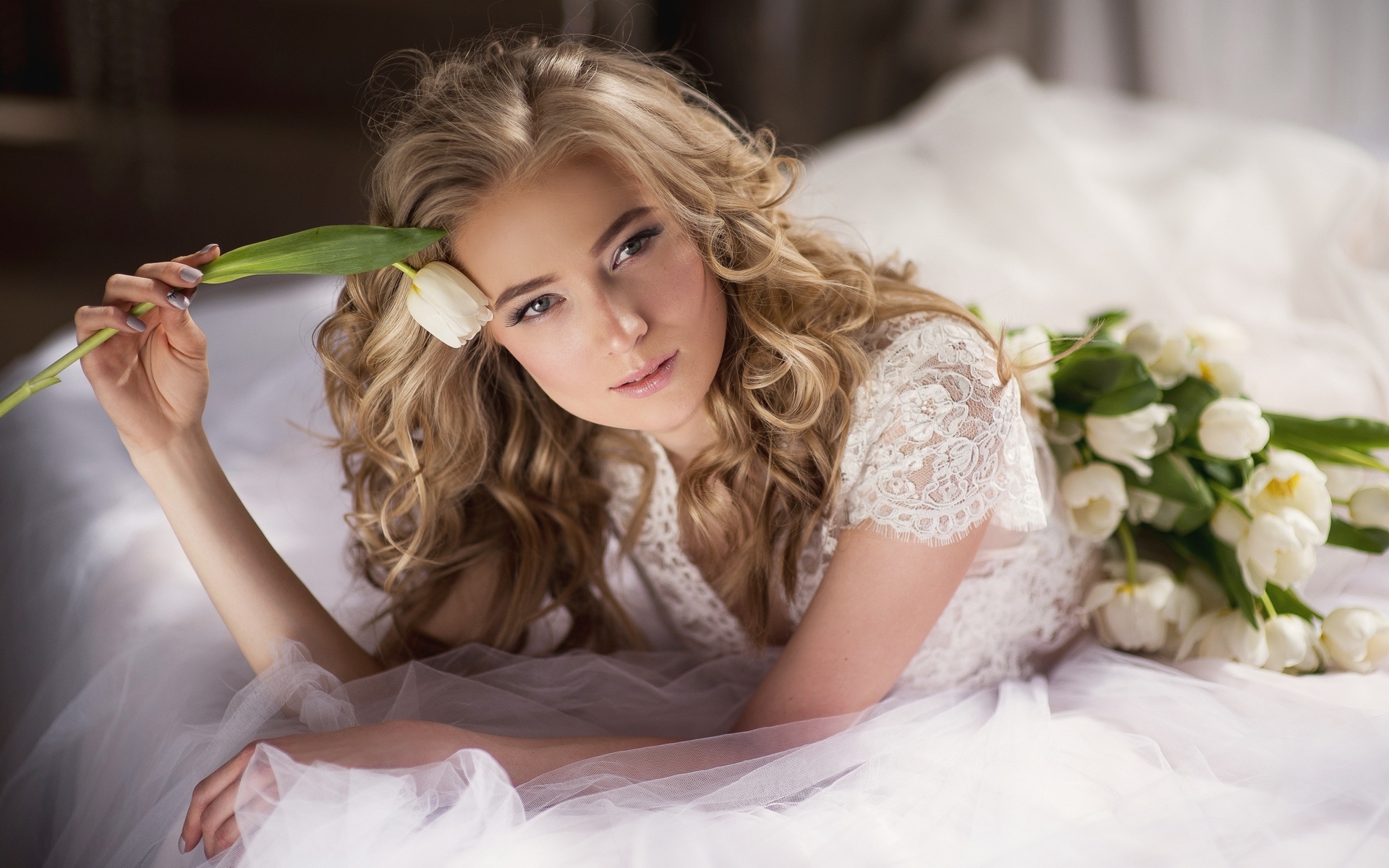 Description: A woman laying on a bed with a bouquet of flowers in her hand and a flower in her hair.