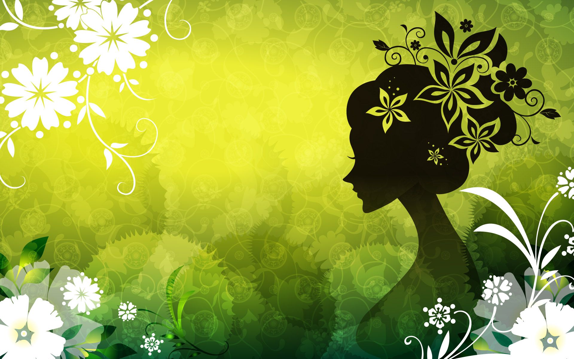 Description: A woman with a flower in her hair on a green background with white flowers and leaves in the foreground.
