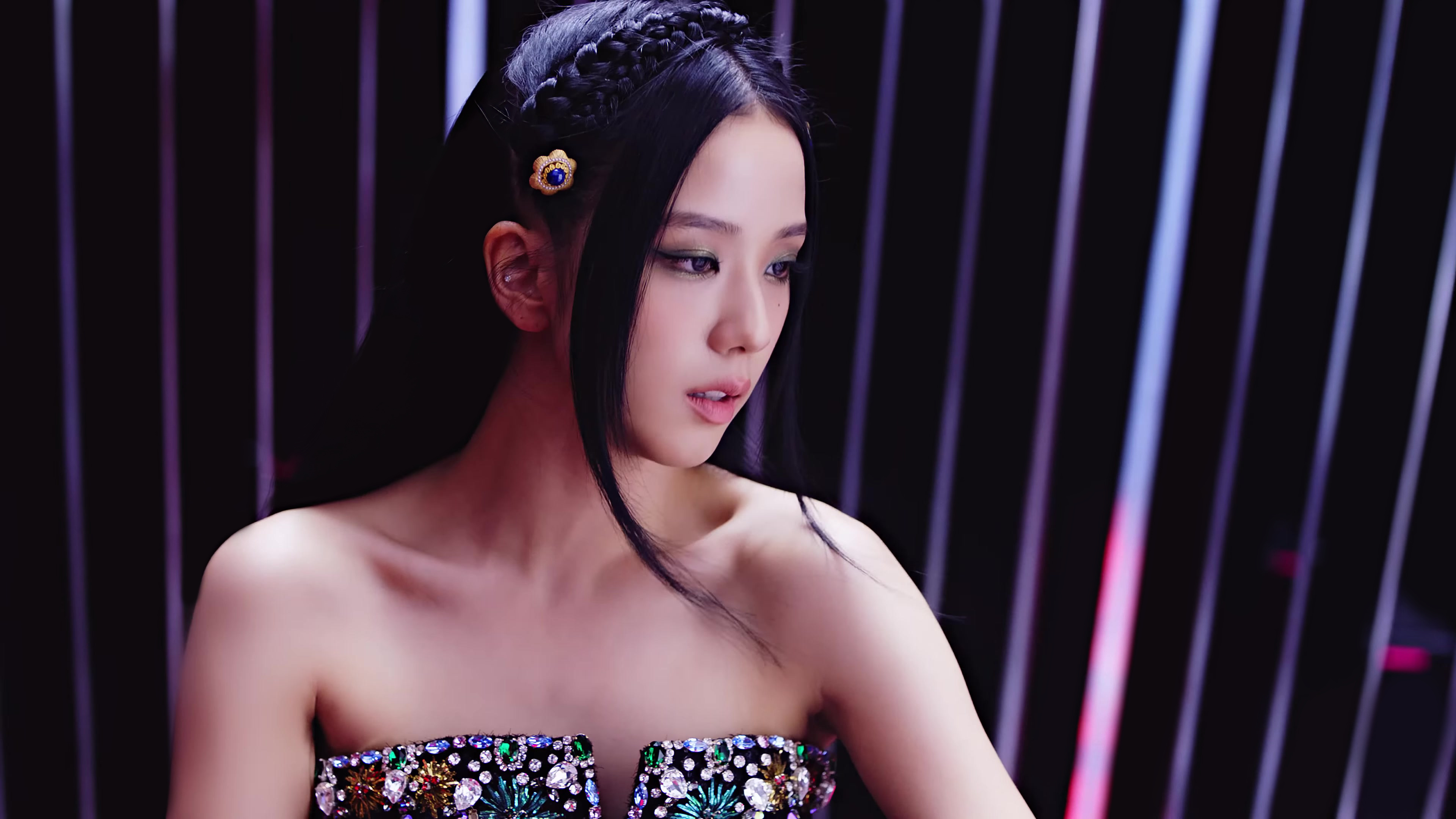 Description: A woman with a flower in her hair looking at her cell phone while wearing a strapless top and a flower in her hair.
