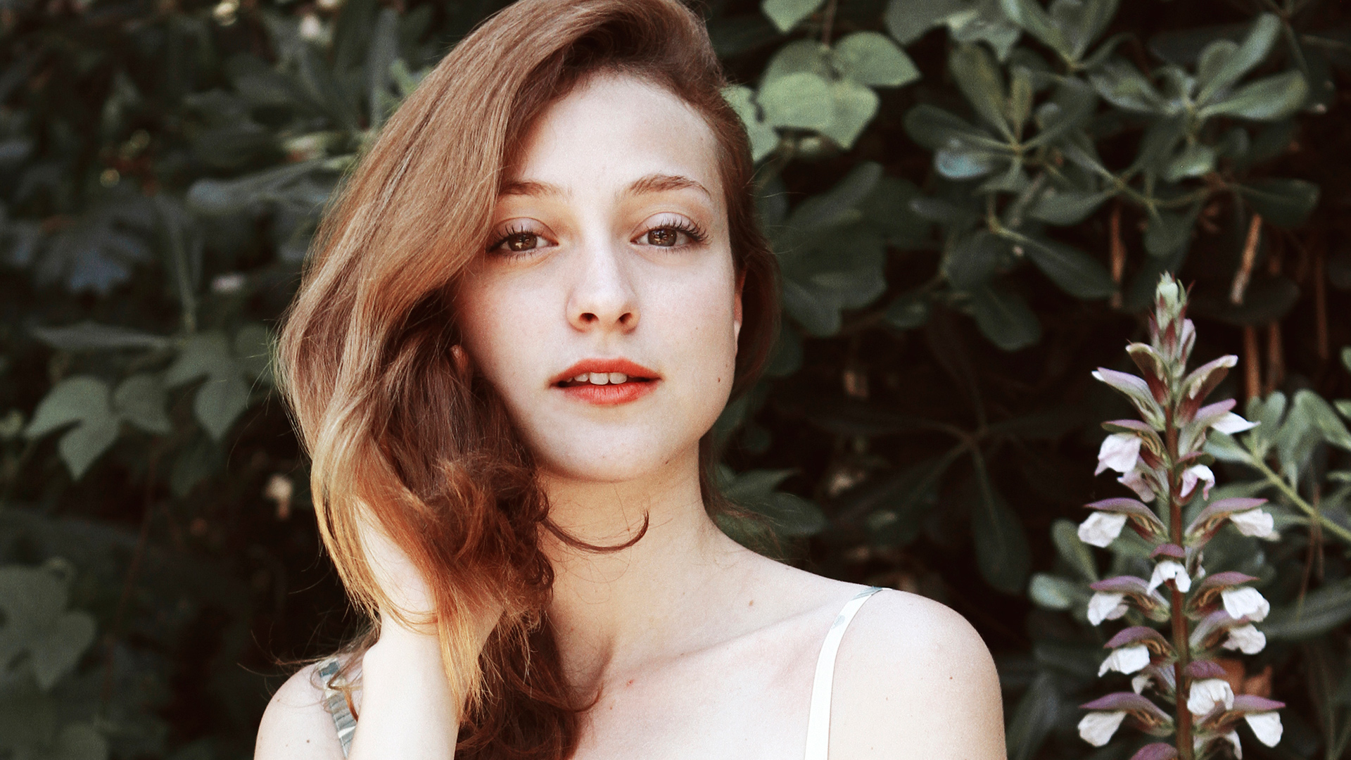 Description: A woman with a flower in her hand and a bush in the background with leaves and flowers in the foreground.