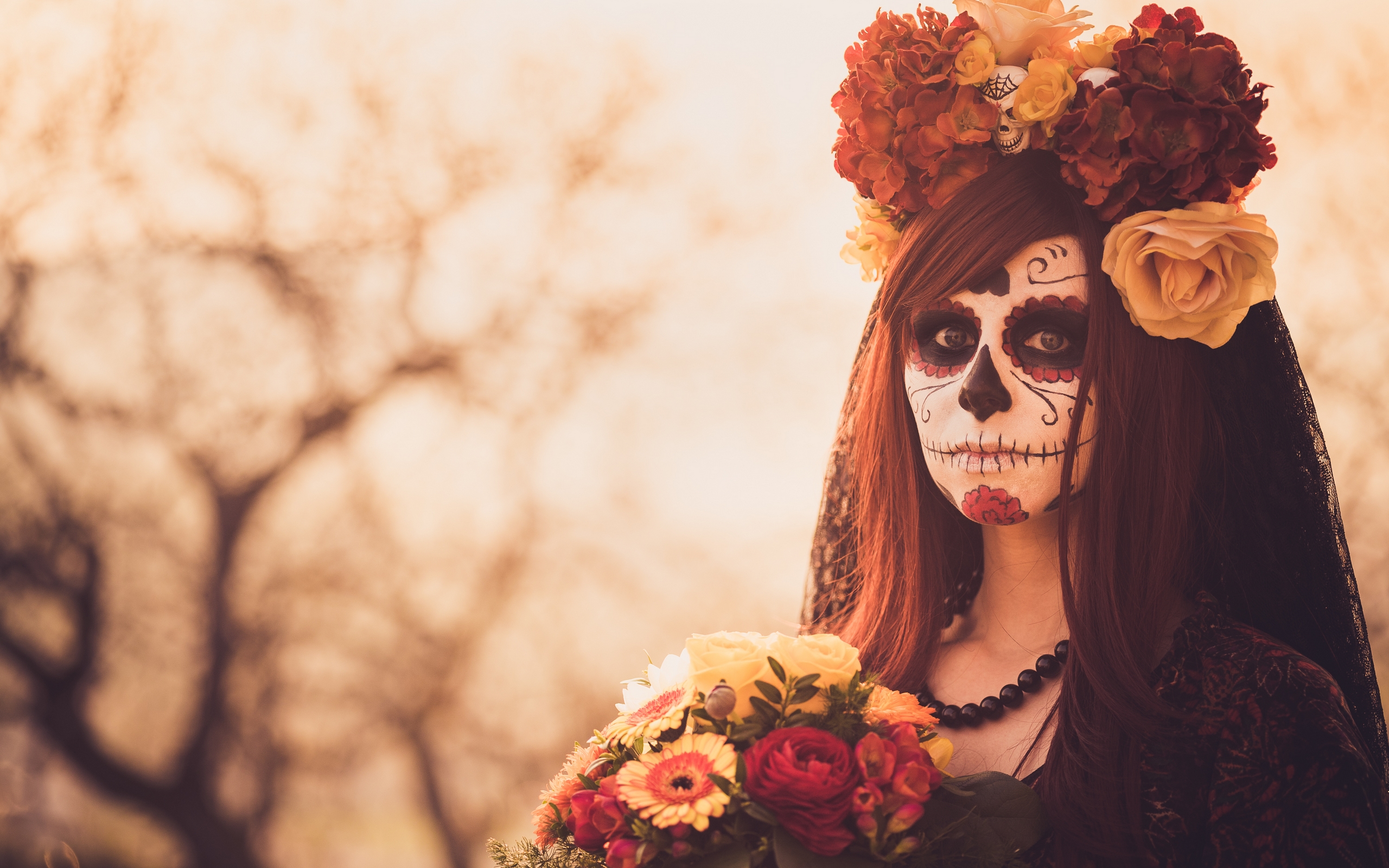 Description: A woman with makeup and flowers in her hair and a skeleton face paint make up on her face and holding a bouquet of flowers.