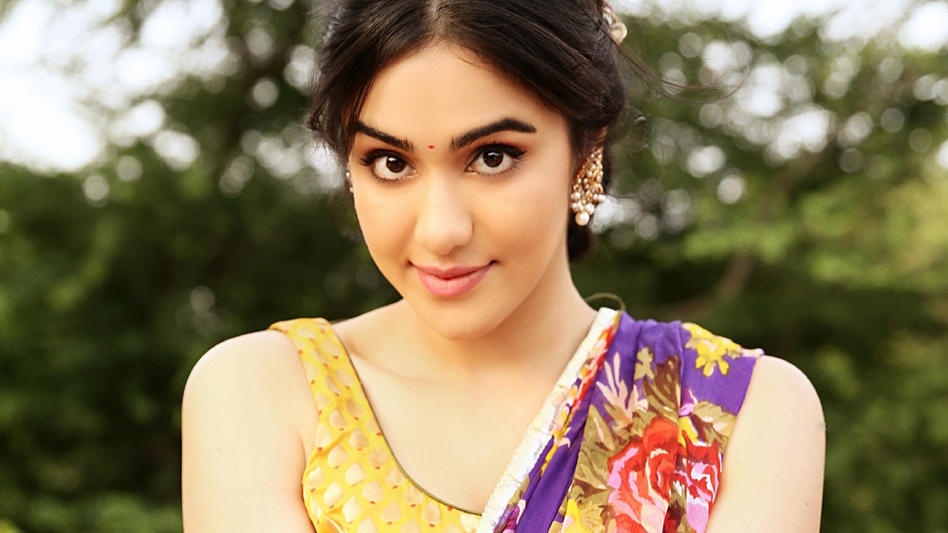 Description: A woman with a flowered dress and a necklace on her neck and a tree in the background with a sky in the background.