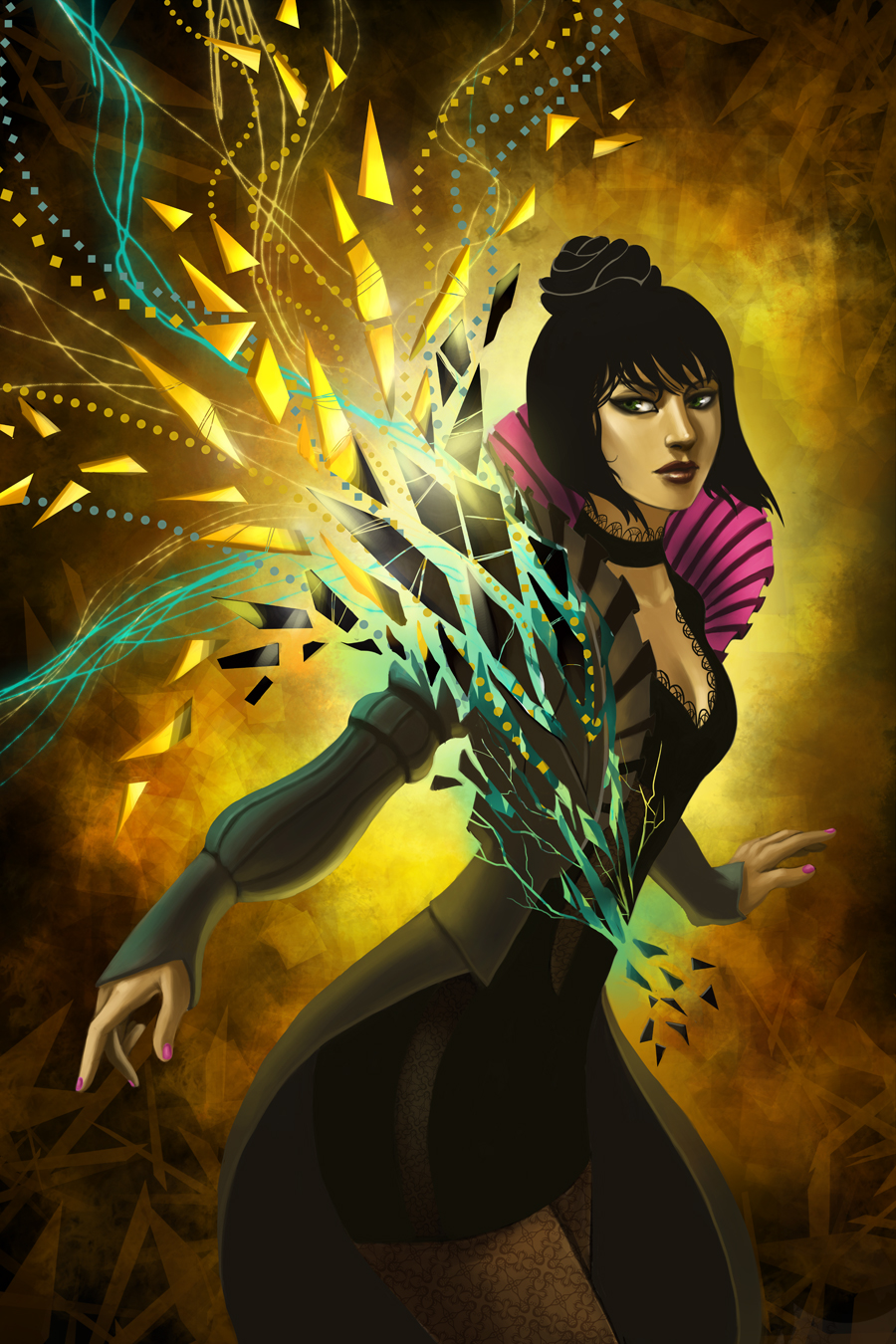 Description: A woman with a bunch of flowers in her hand and a firework background behind her.