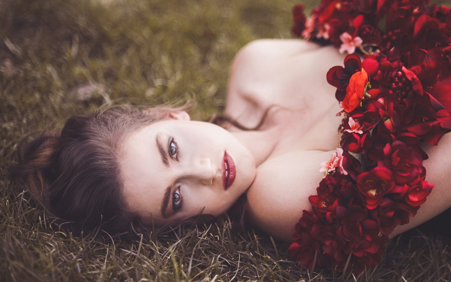 Description: A woman laying on the ground with flowers around her neck and eyes closed.