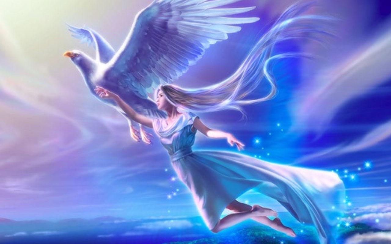 Description: A woman flying through the air with a bird on her arm and a bird on her shoulder.