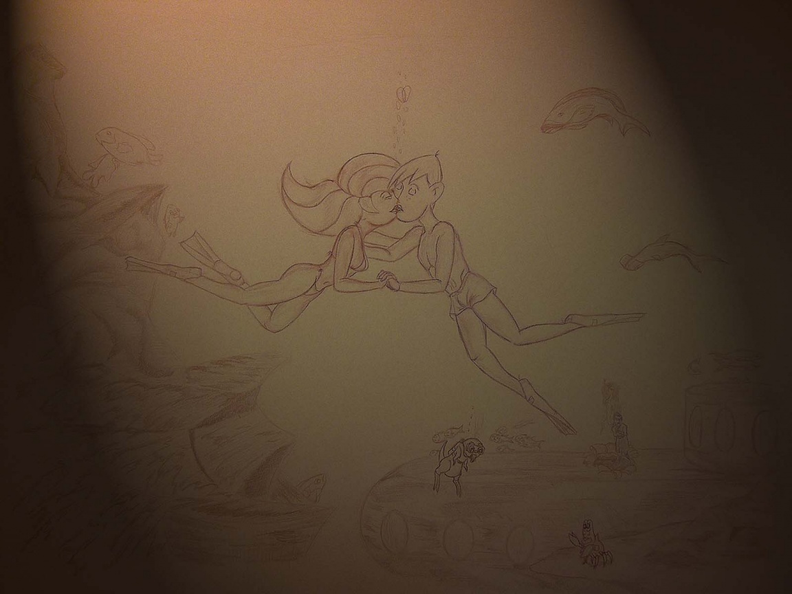 Description: A drawing of a woman flying through the air with a cat on her back and a bird flying above her.