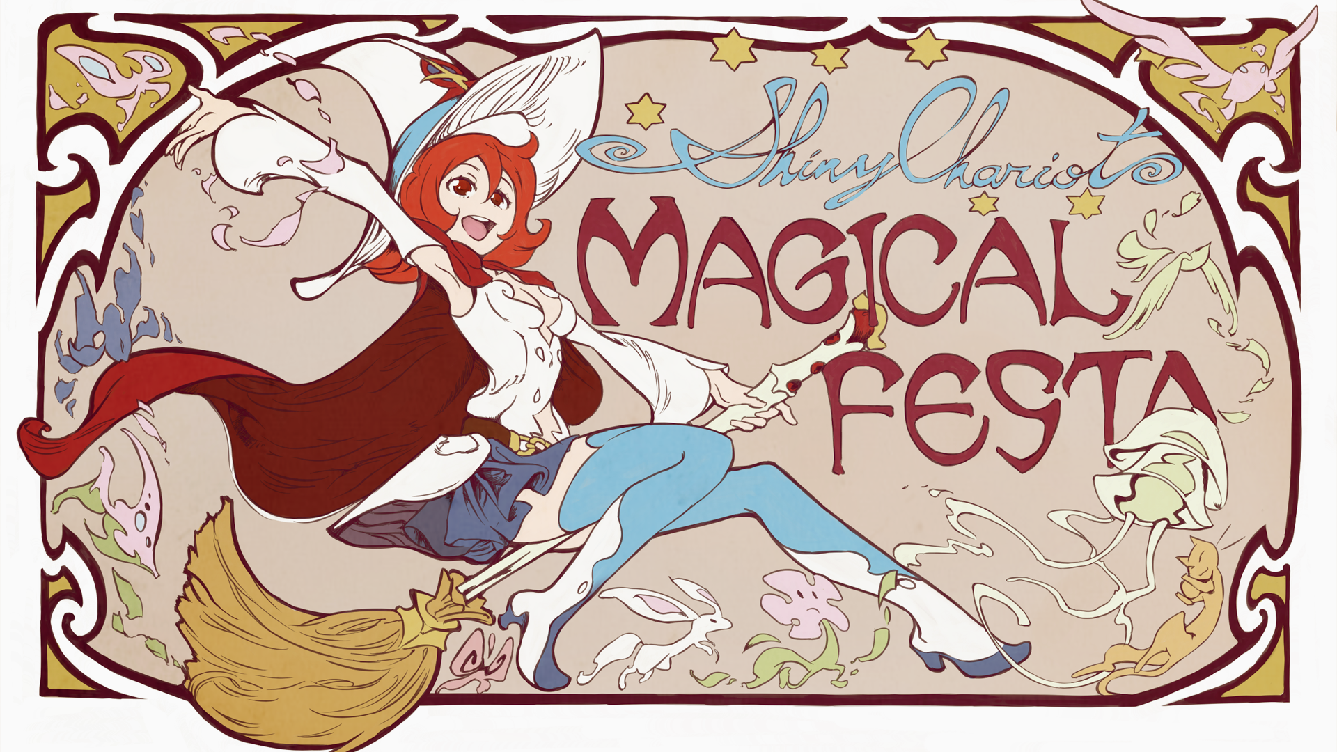 Description: A cartoon of a woman flying through the air with a sword in her hand and a sign that says fairy princess's magic festival.