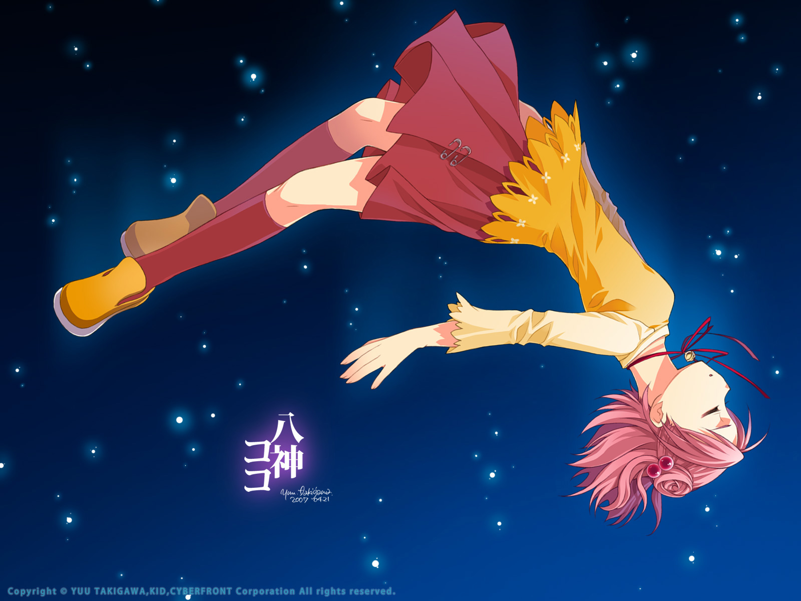 Description: A woman flying through the air while wearing a dress and holding a umbrella in her hand and a star in the background.