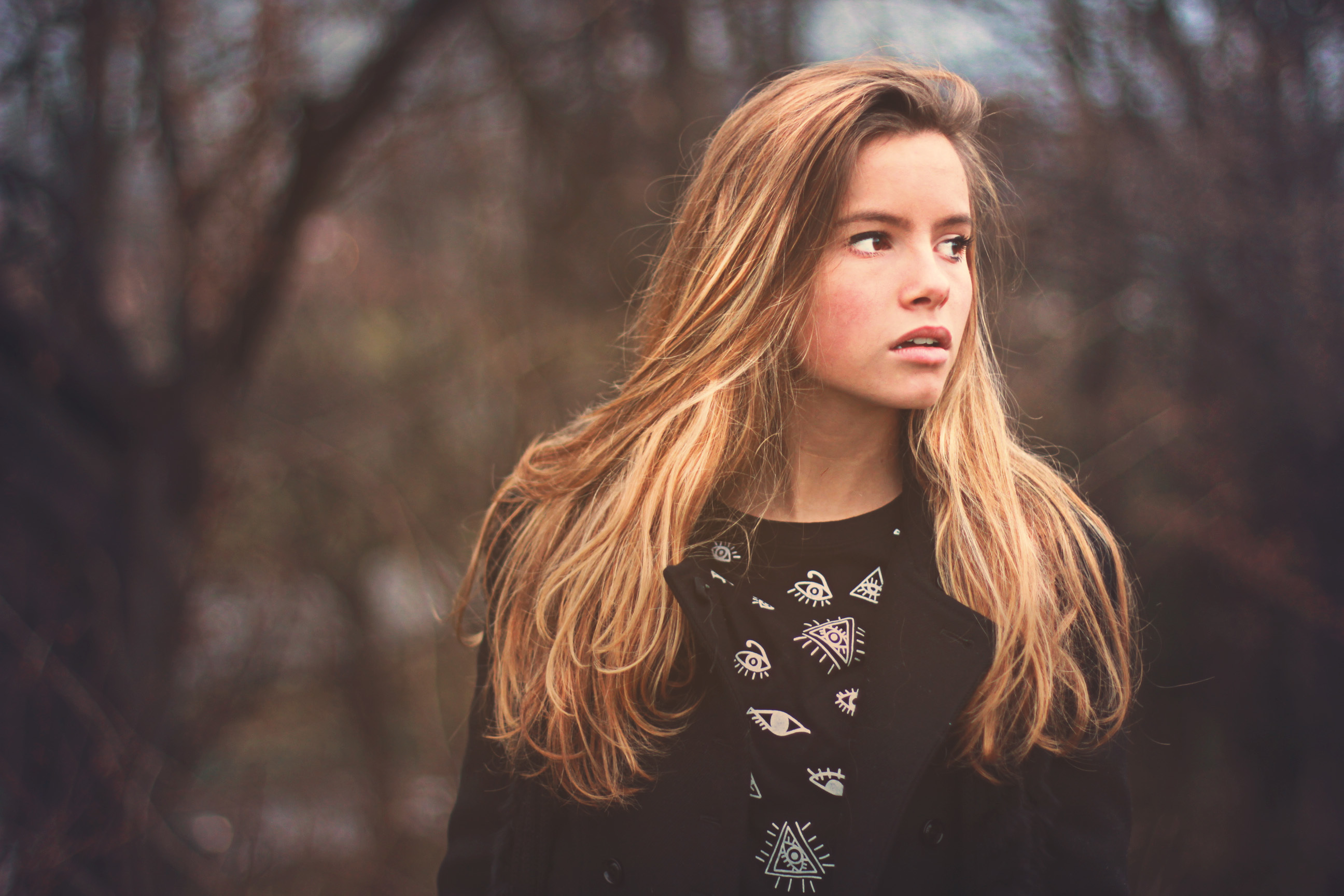 Description: A woman with long hair standing in a forest looking off into the distance with trees in the background and a snowflaked sky.