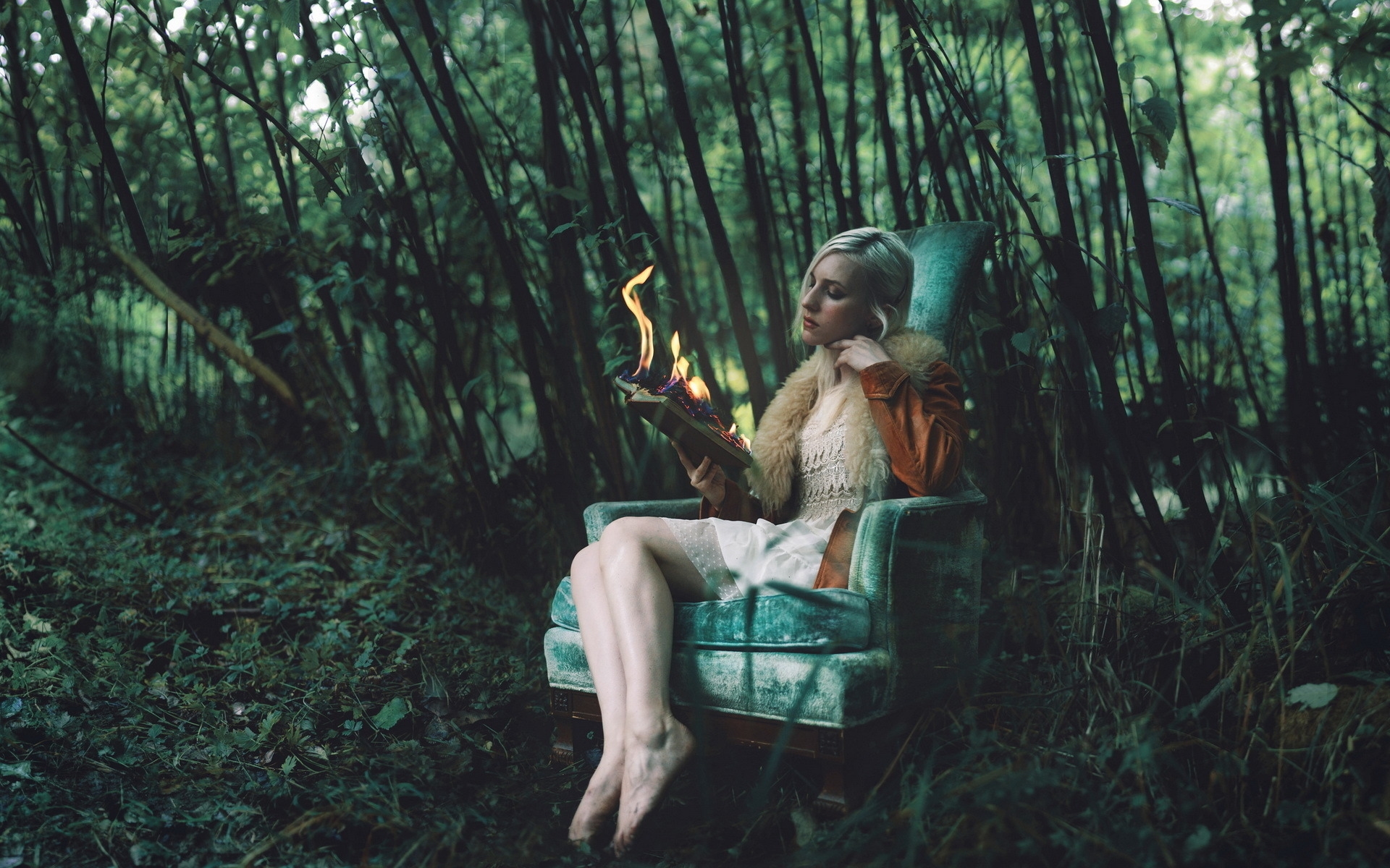 Description: A woman sitting in a chair in a forest holding a lit candle in her hand and a book in her other hand.