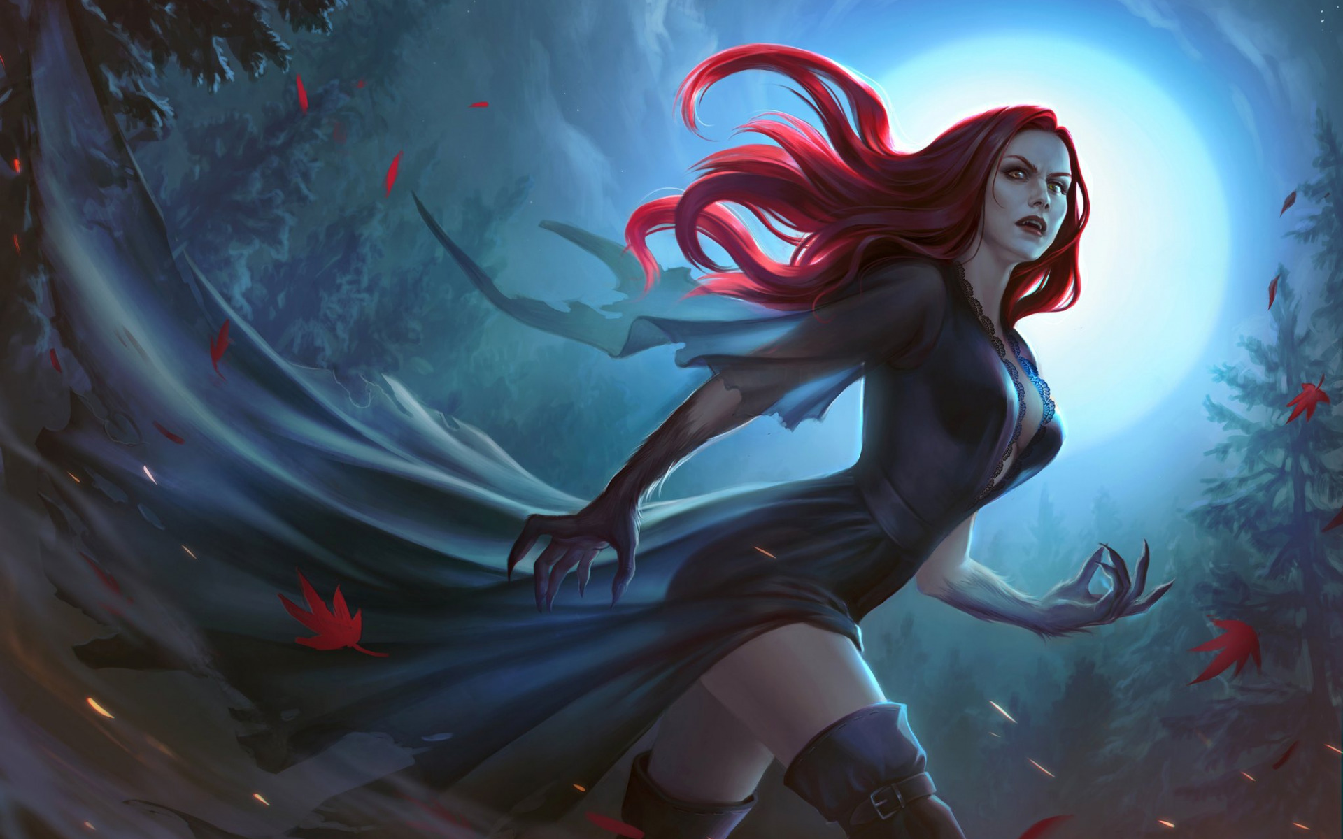 Description: A woman in a dress and boots is walking through a forest with a full moon in the background and leaves flying around her.