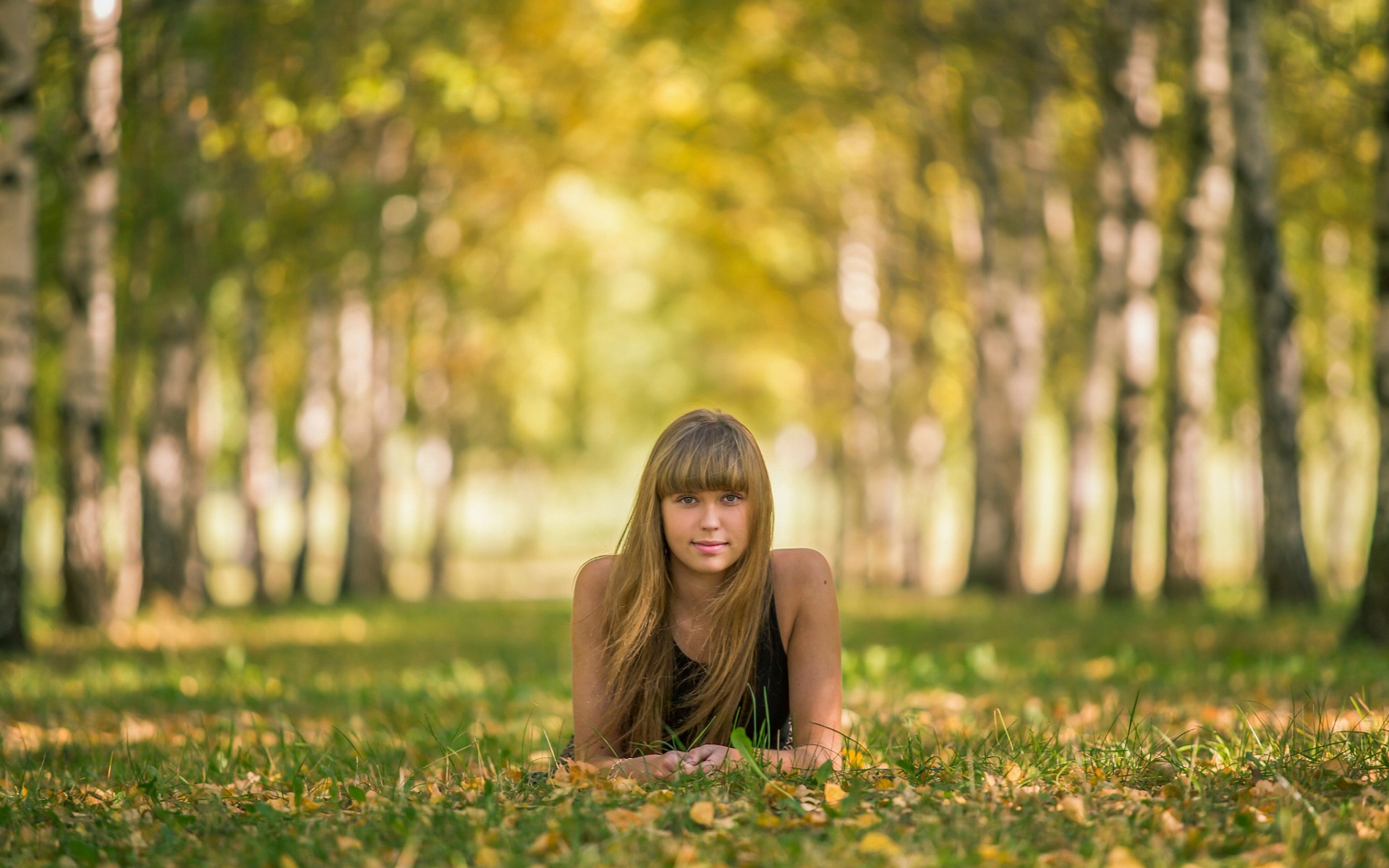 Description: A woman laying on the ground in a forest with trees in the background and leaves on the ground and grass in the foreground.