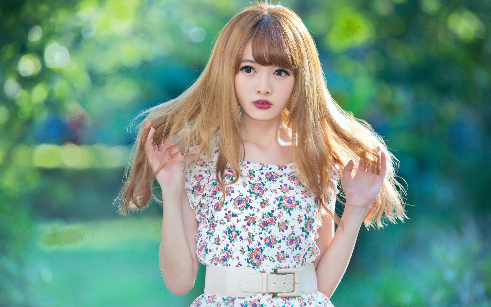 Description: A woman with long hair standing in front of a forest with trees and grass in the background.