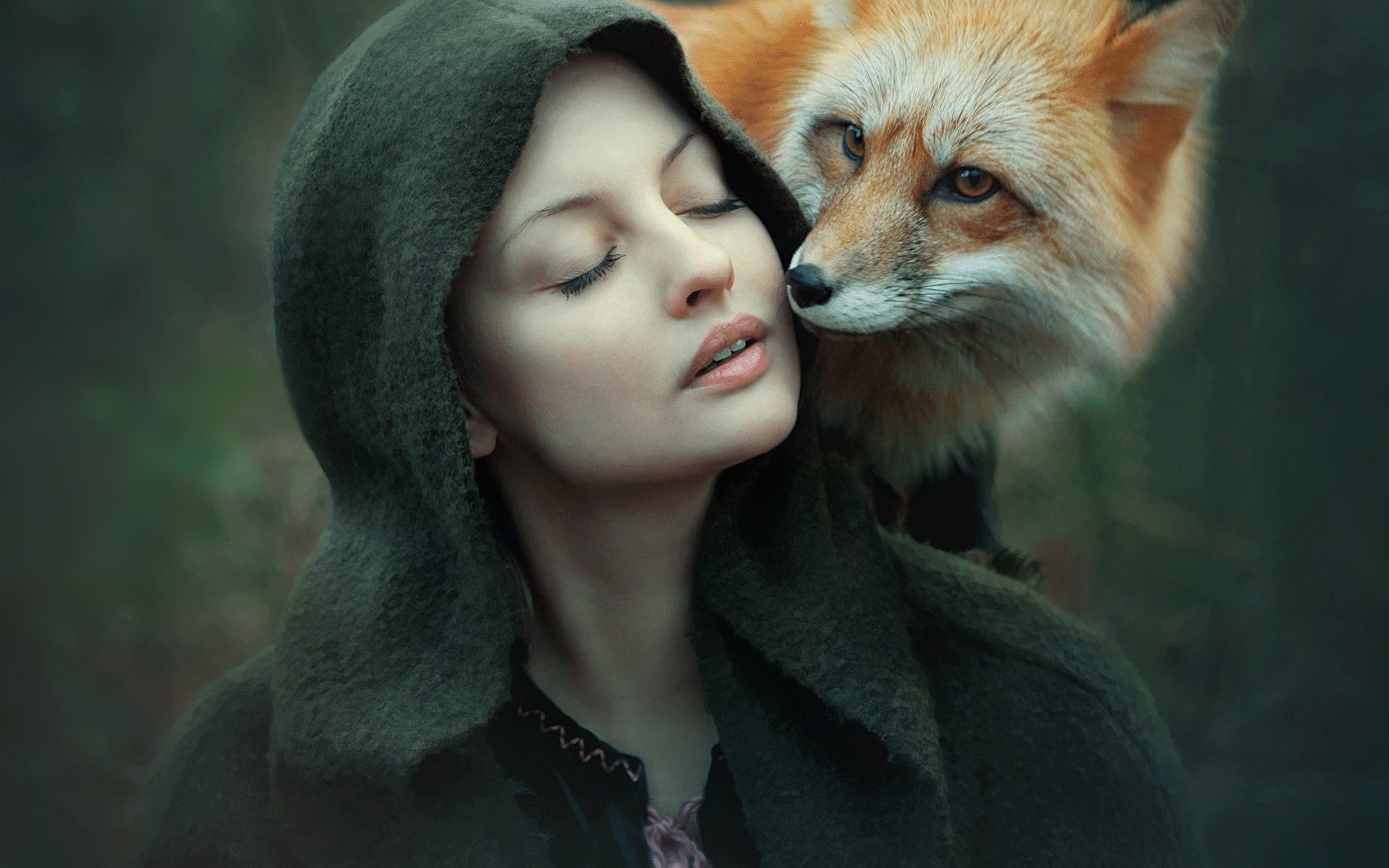 Description: A woman with her eyes closed and a fox on her shoulder behind her head.