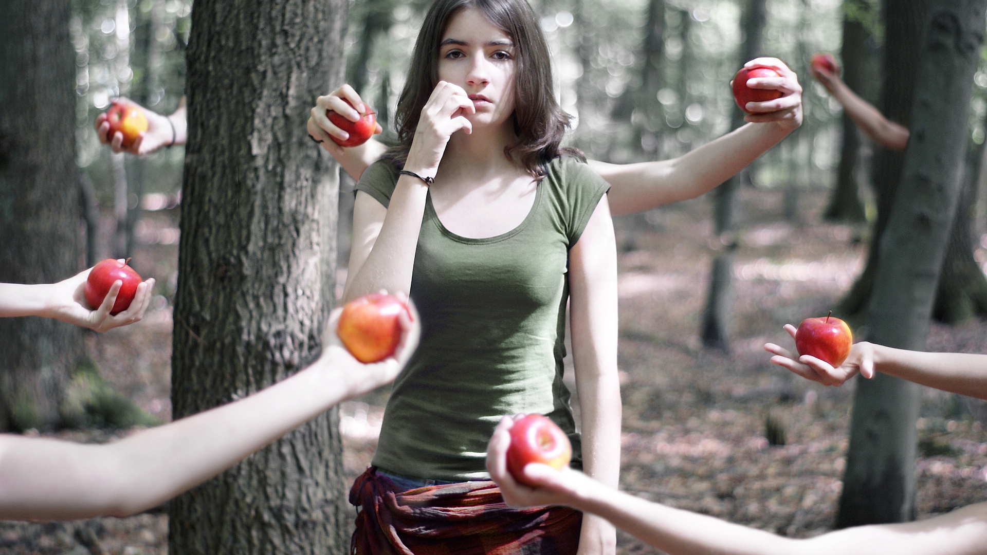 Description: A woman is surrounded by her friends in the woods eating apples from the trees and holding them in their hands.