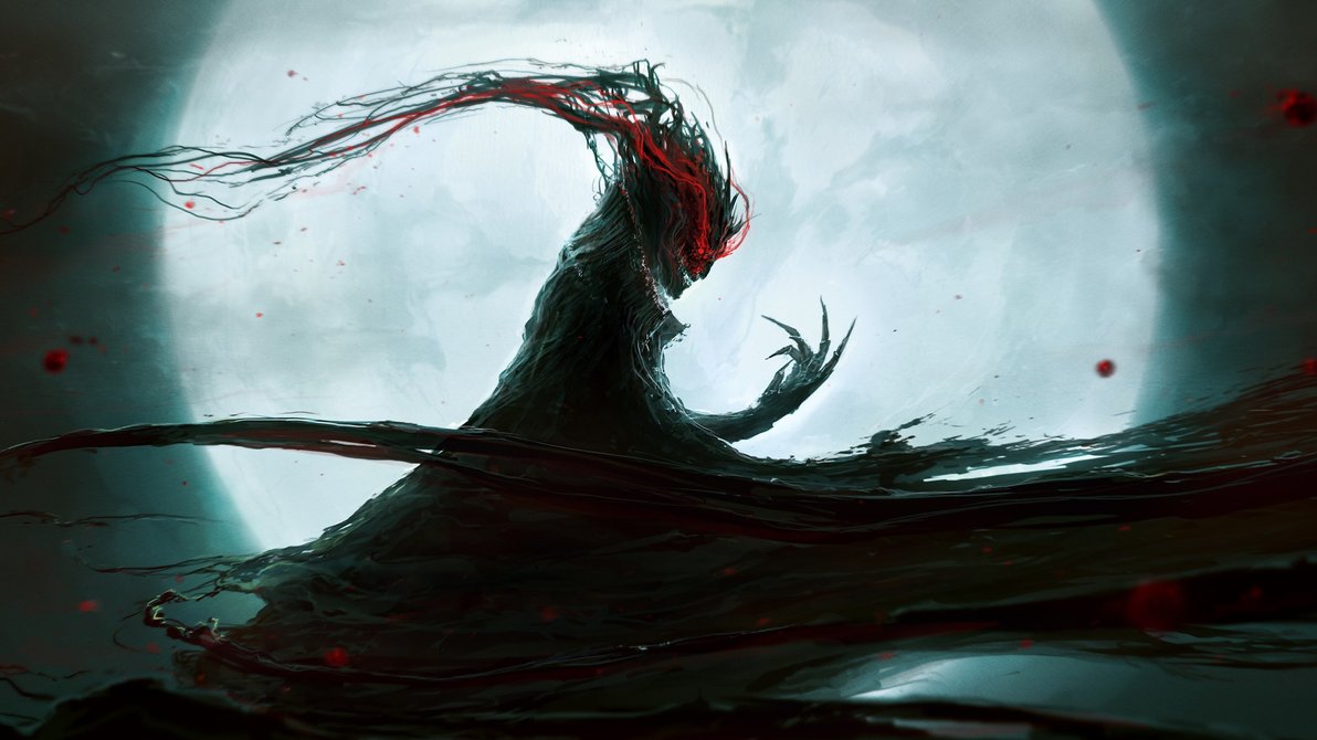 Description: A woman with long hair standing in front of a full moon with blood flowing from her hands and her hair in the air.