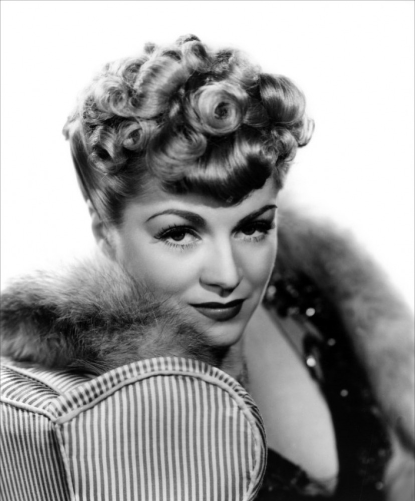 Description: A woman with a fur collar and a striped dress shirt and a fur collar on her head and shoulders.