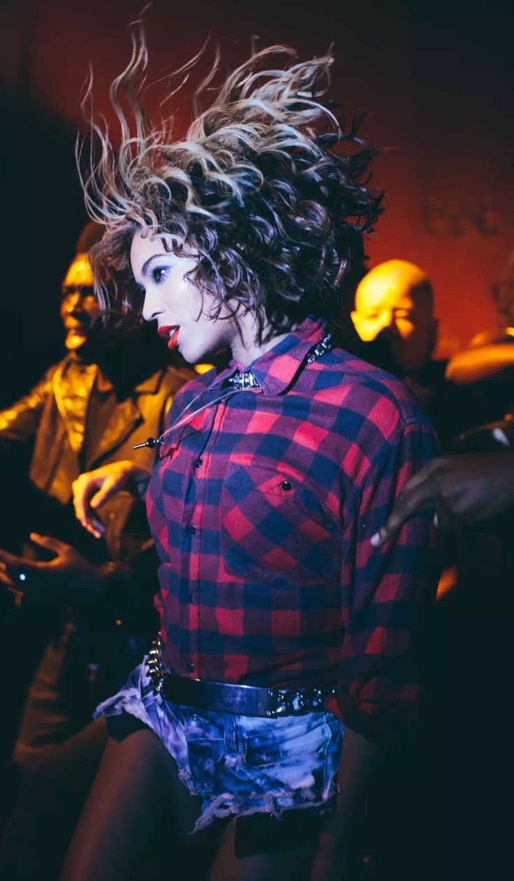 Description: A woman with a weird haircut standing in front of a group of people in a dark room with a man in the background.