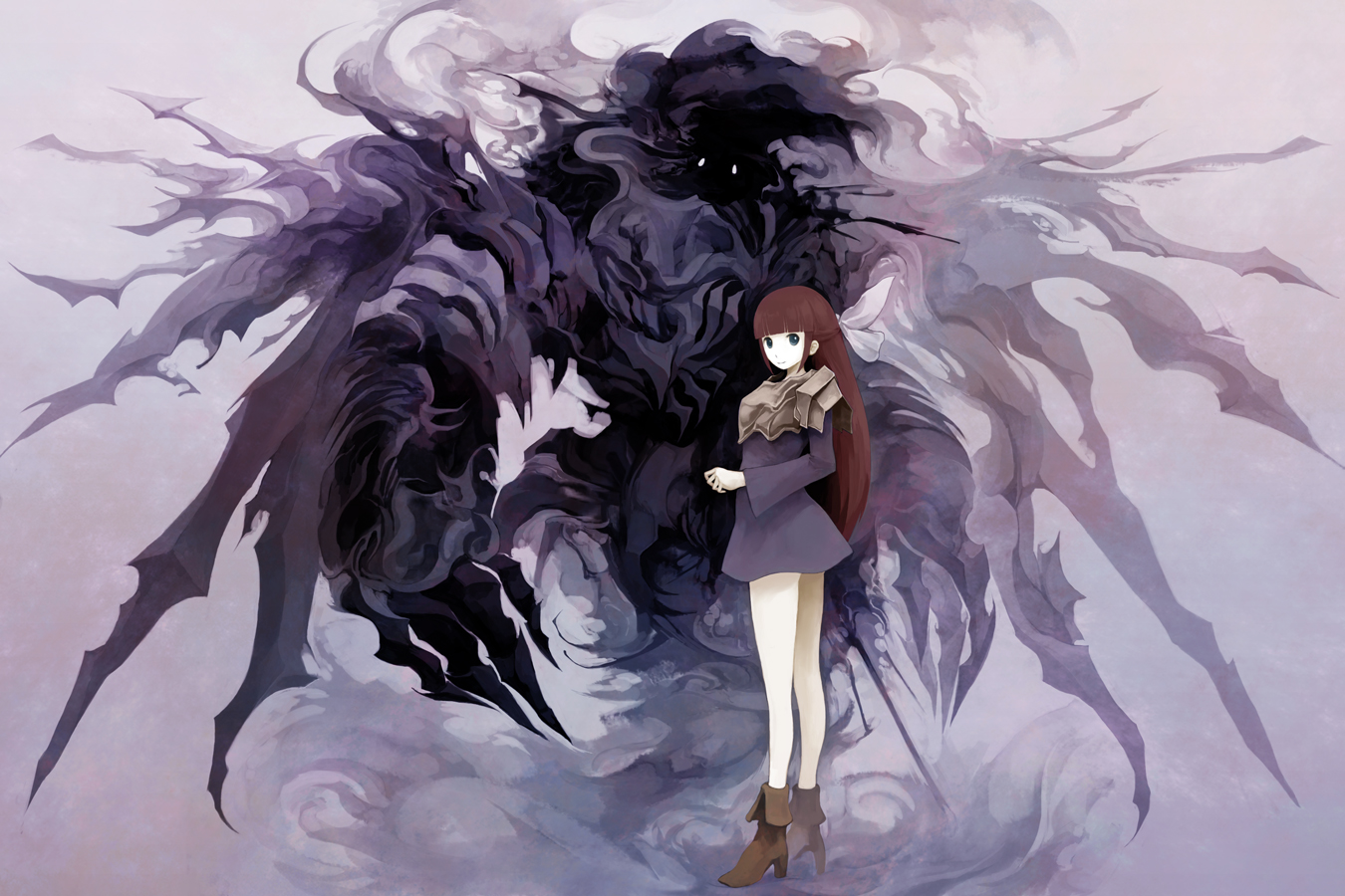 Description: A woman standing in front of a giant black monster like creature with her hands on her chest and a scarf around her neck.