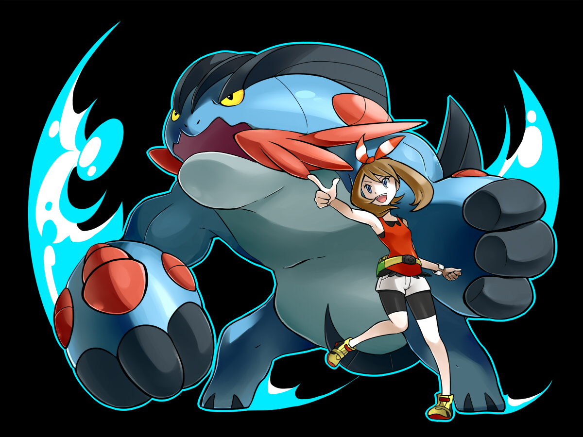 Description: A woman standing next to a giant blue monster with a red face and a red shirt on.