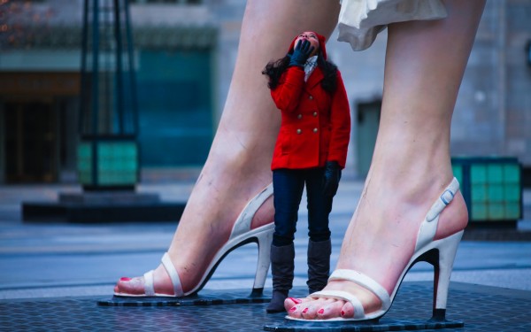 Description: A woman in high heels standing next to a little girl in a red jacket and white skirt and heels.