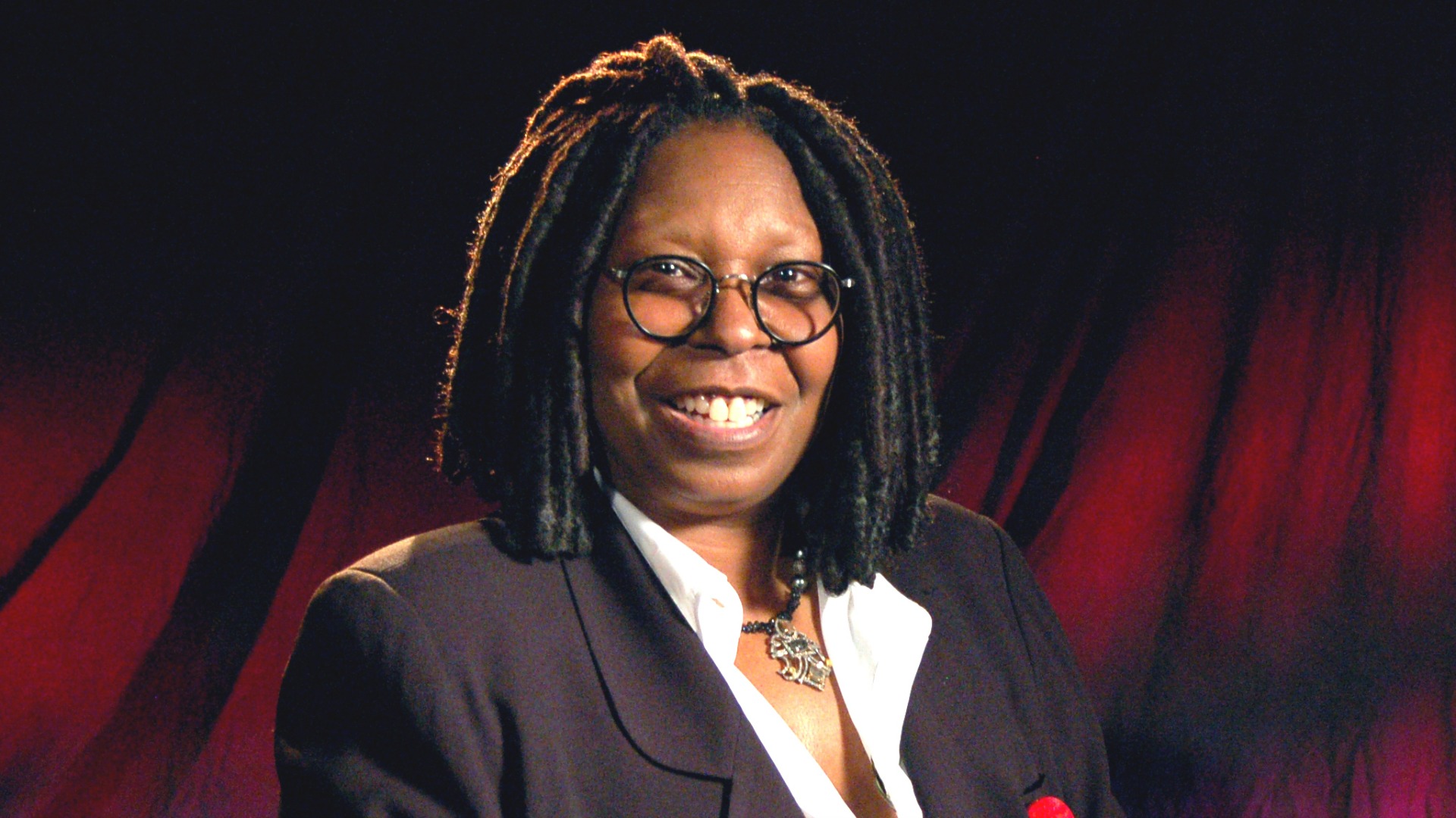 Description: A woman with glasses and a red rose in her lapel smiles for the camera while standing in front of a red curtain.