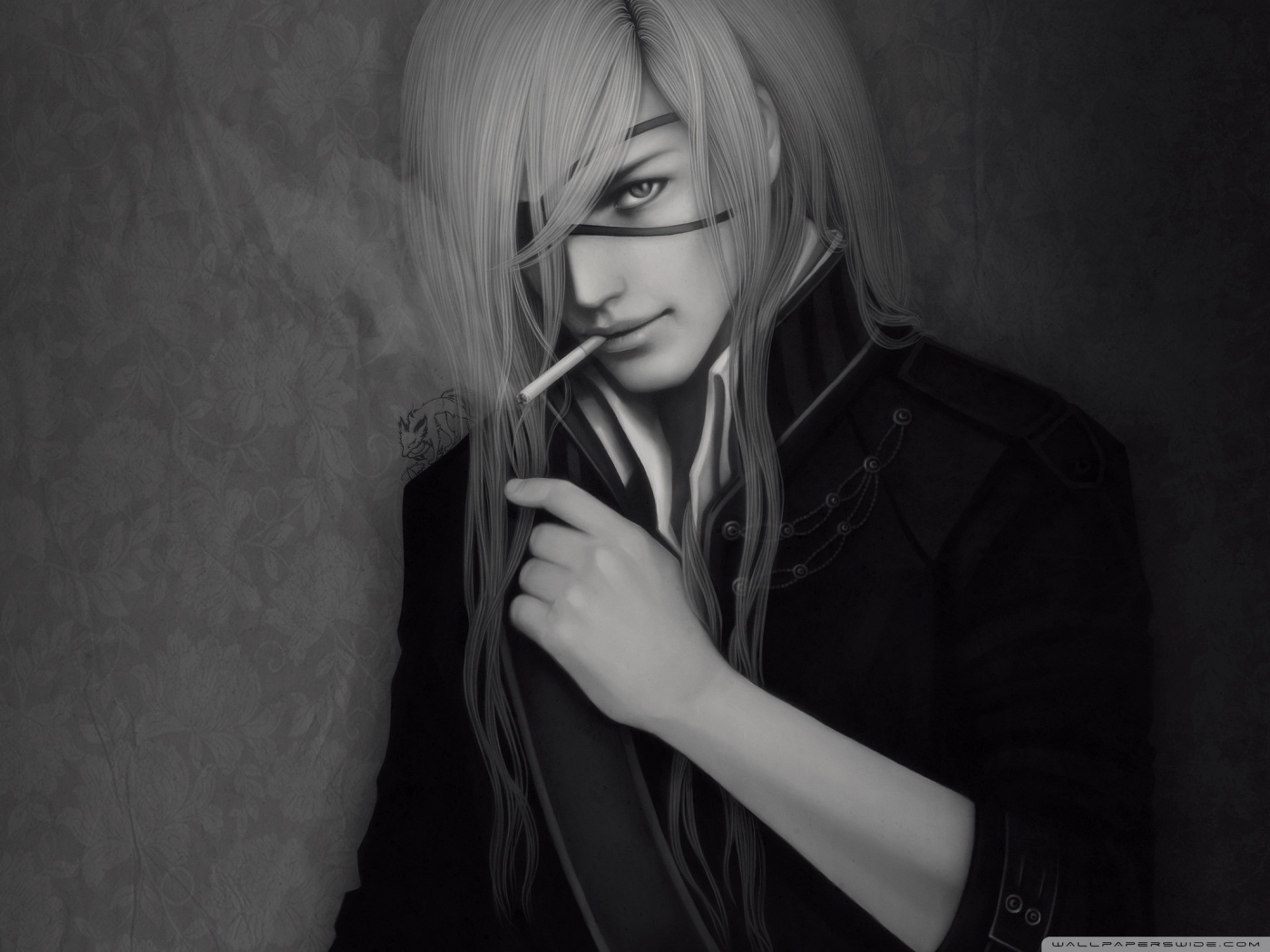 Description: A drawing of a woman with glasses smoking a cigarette and looking at the camera with a serious look on her face.