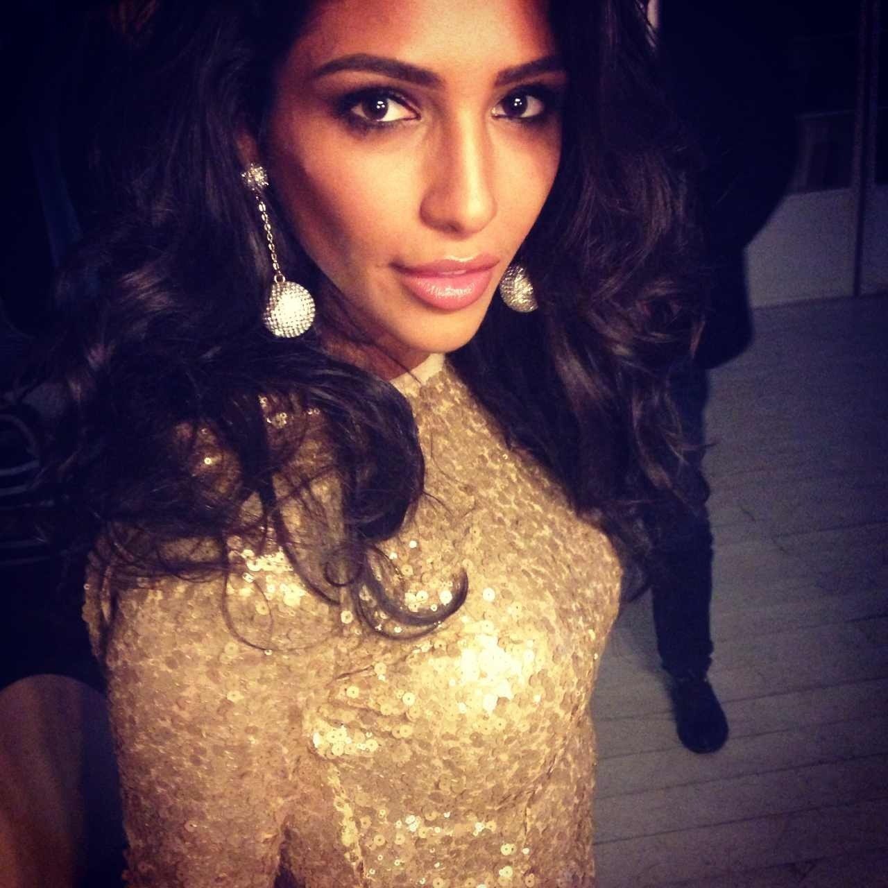 Description: A woman in a gold dress posing for a picture with her hair in a ponytail and earrings on her head.