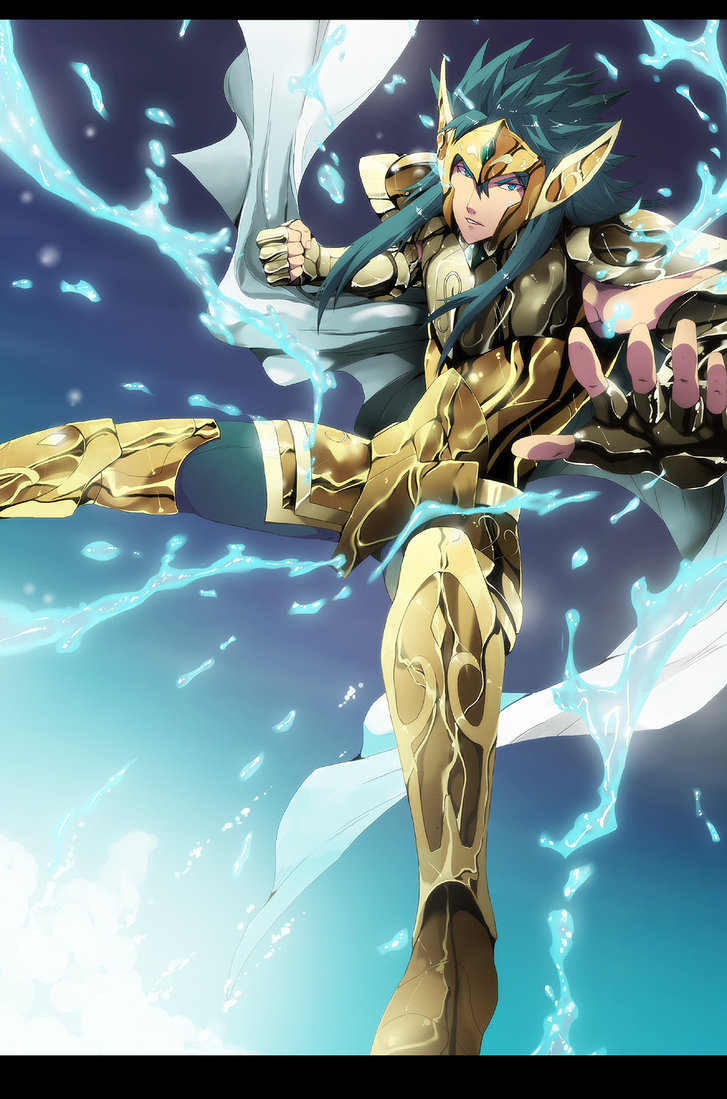 Description: A woman in a gold outfit is holding a sword and a white bird is flying above her head and a blue background.