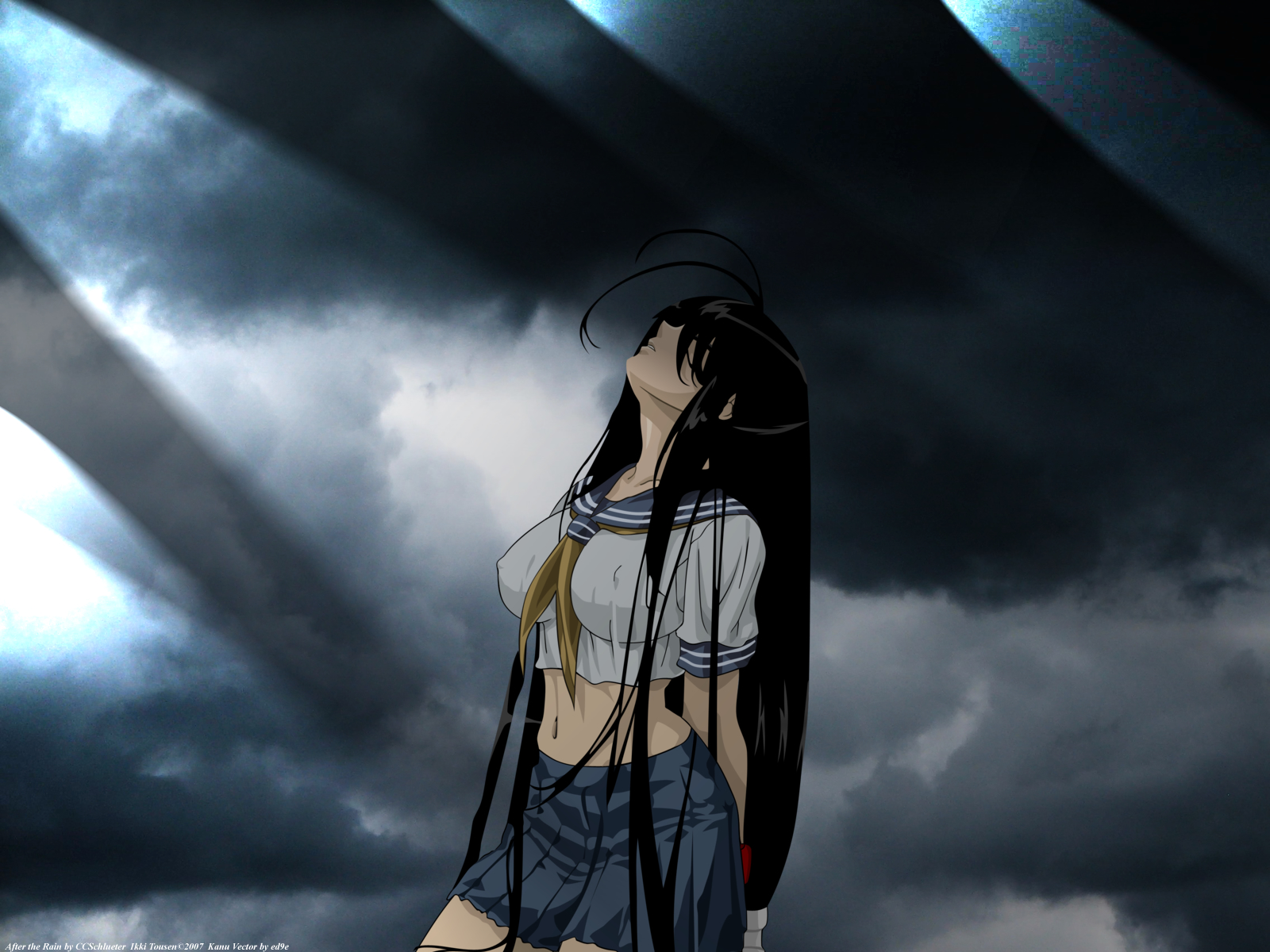 Description: A woman standing under a cloudy sky with her hair in the wind and her eyes closed.
