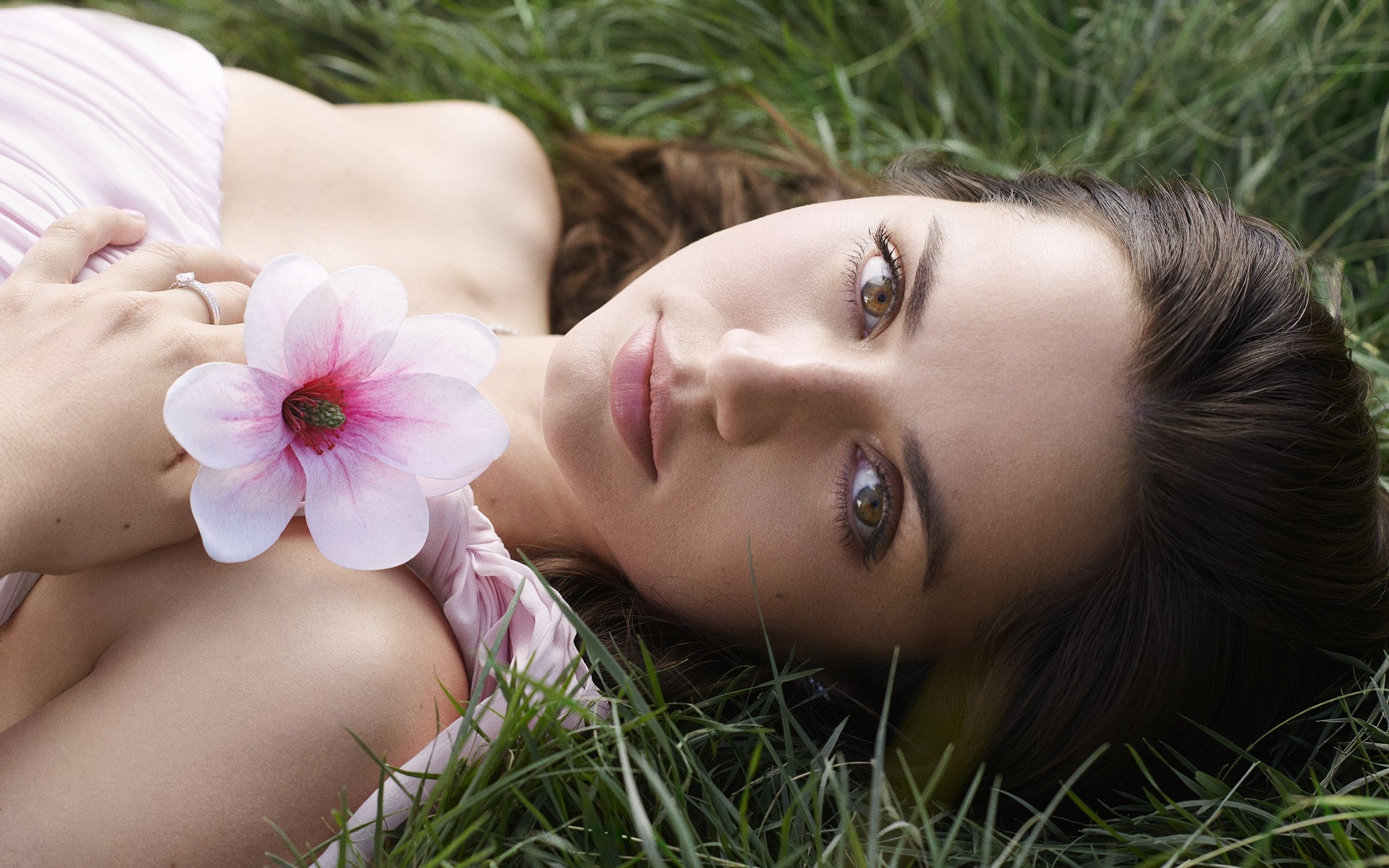 Description: A woman laying in the grass with a flower in her hand and her eyes closed.