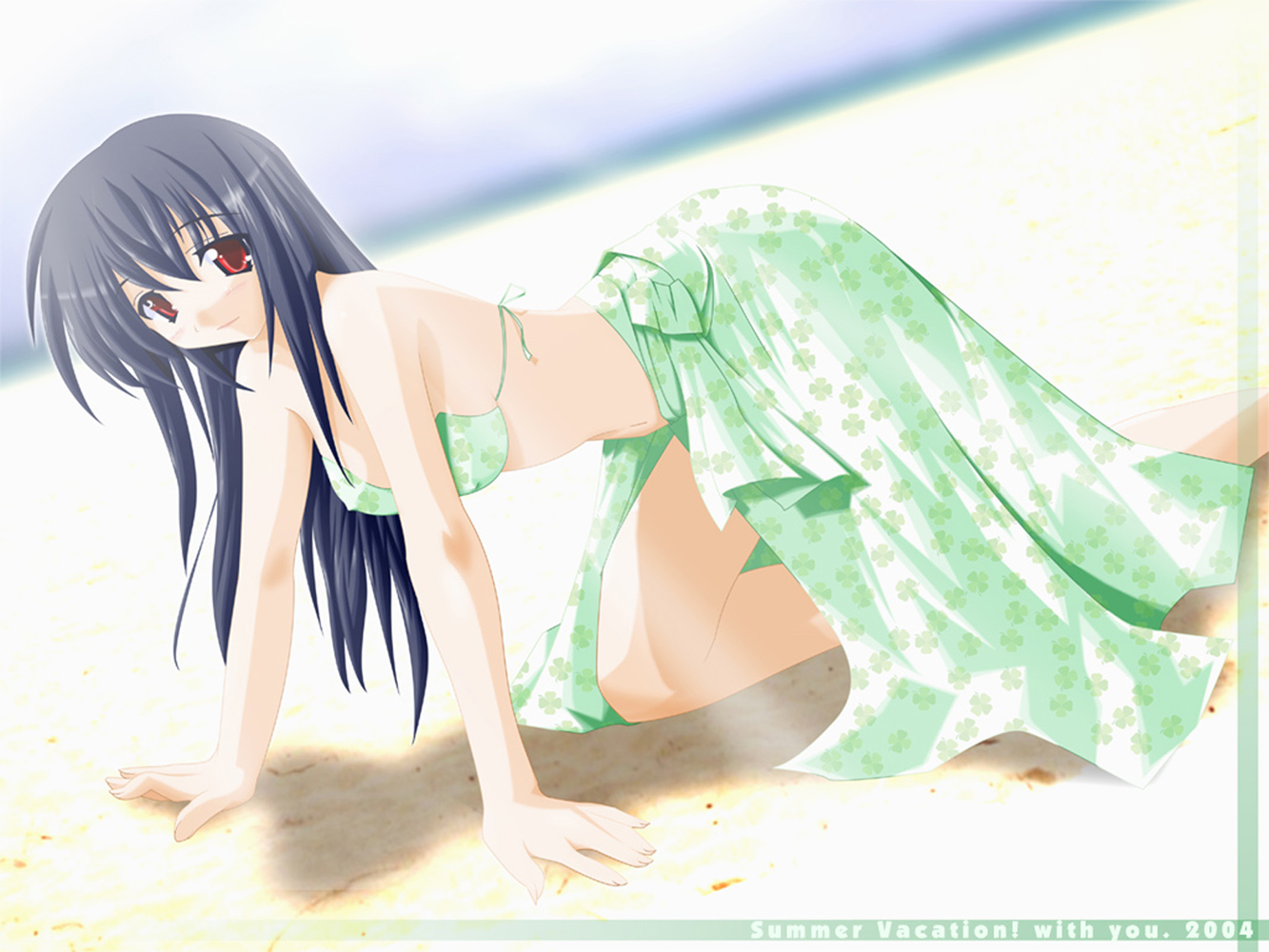 Description: A woman in a green dress laying on the beach with her legs crossed and her head down on her knees.