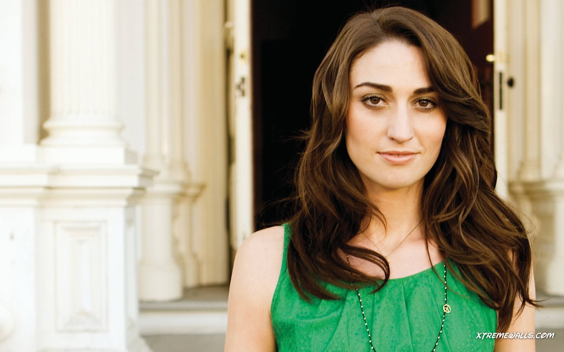 Description: A woman in a green dress standing in front of a building with a clock on it's side.