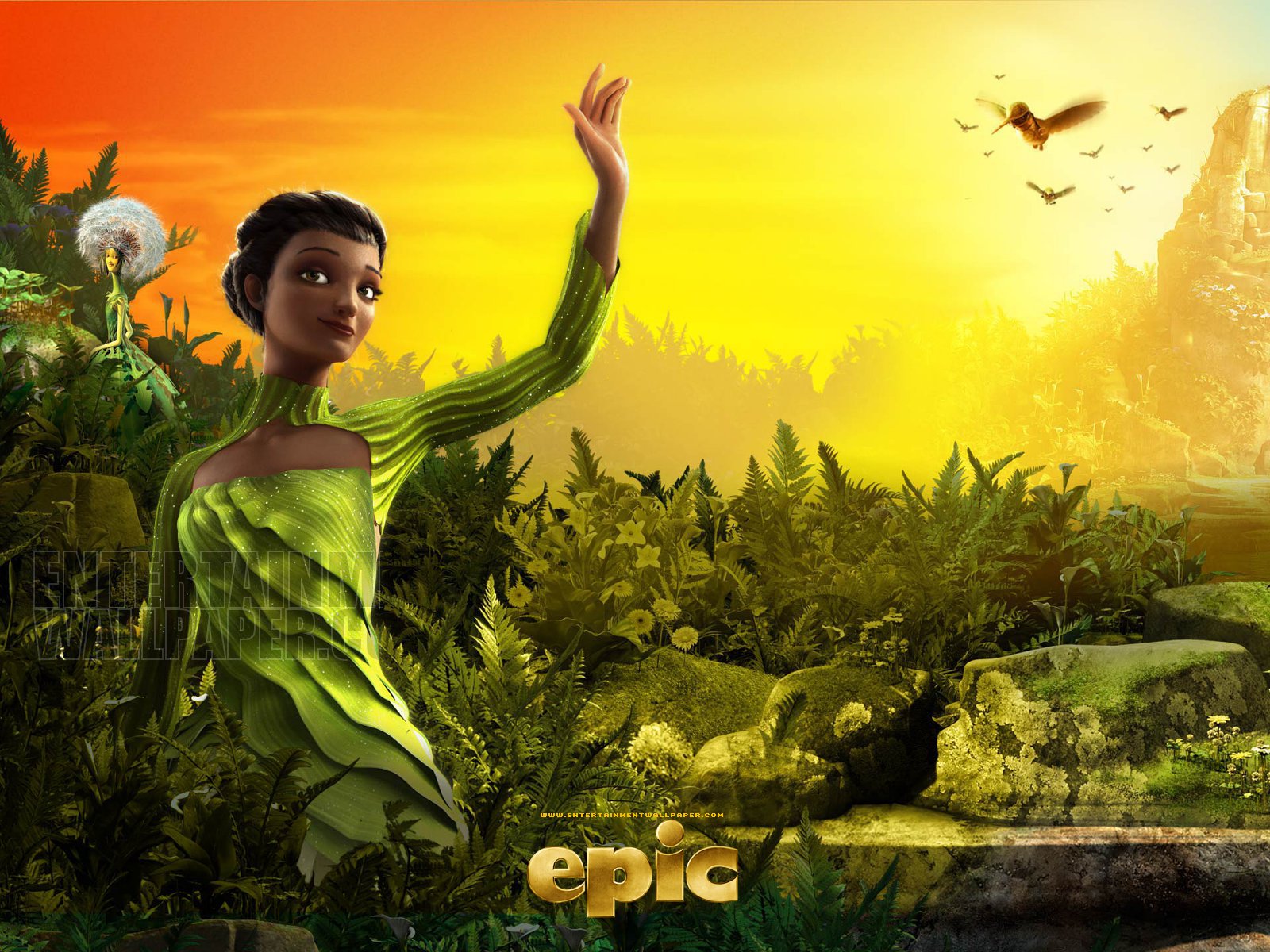 Description: A woman in a green dress is in the grass with a dandelion in her hand and a bird flying above her.