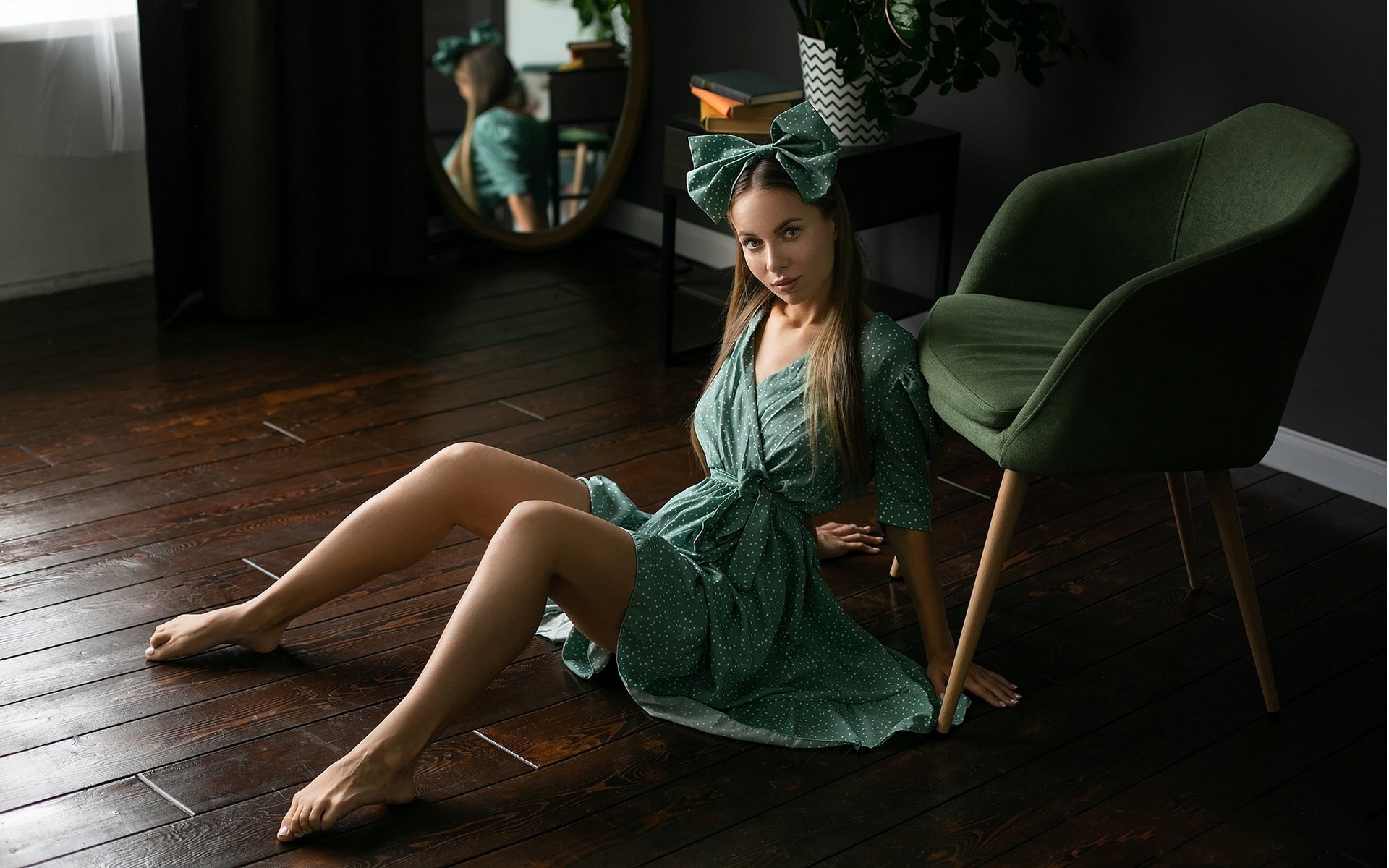 Description: A woman sitting on the floor in a green dress and a green chair with a mirror behind her and a green chair.