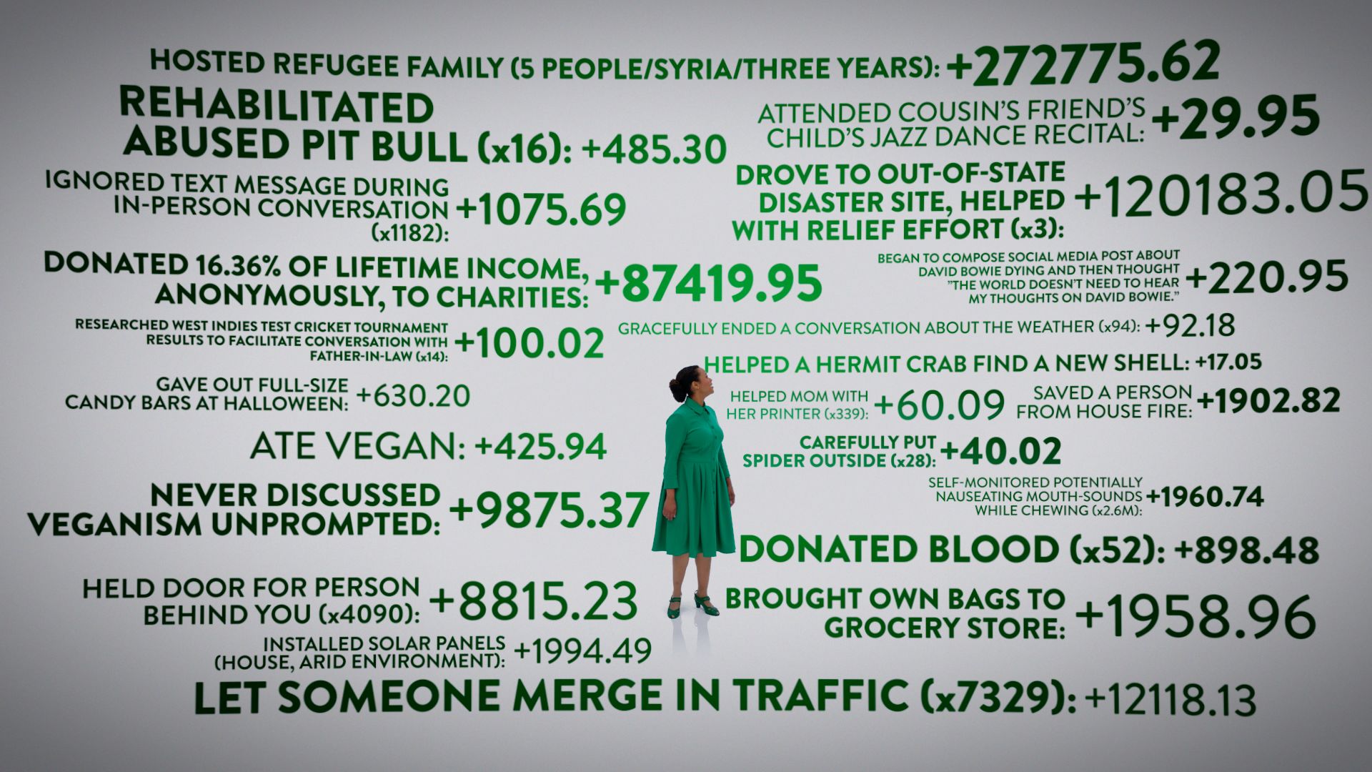 Description: A woman in a green dress standing in front of a poster with words written in green on it and a woman in a green dress standing in front of a white background.