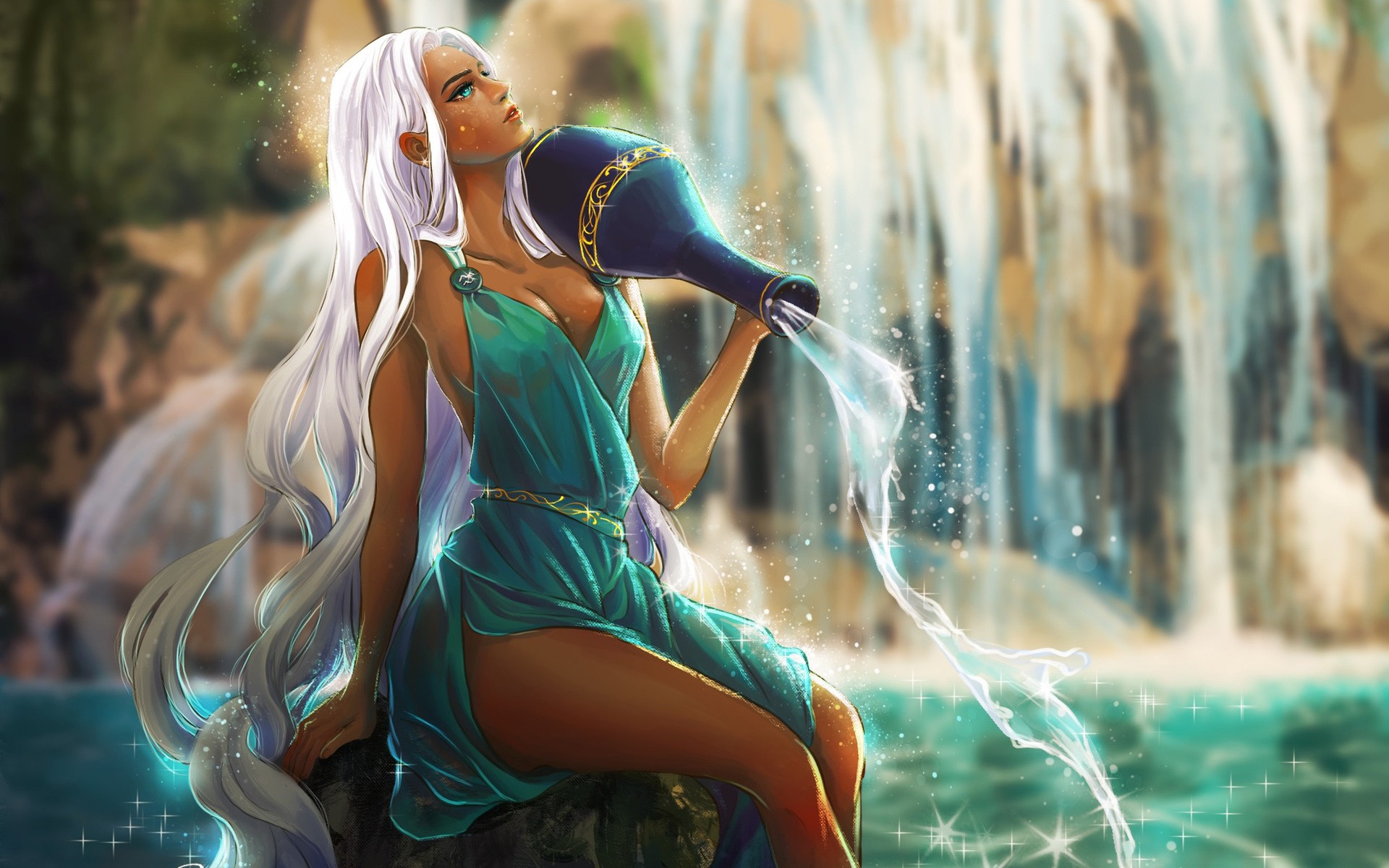 Description: A woman in a green dress sitting on a rock next to a waterfall with a blue bag in her hand.