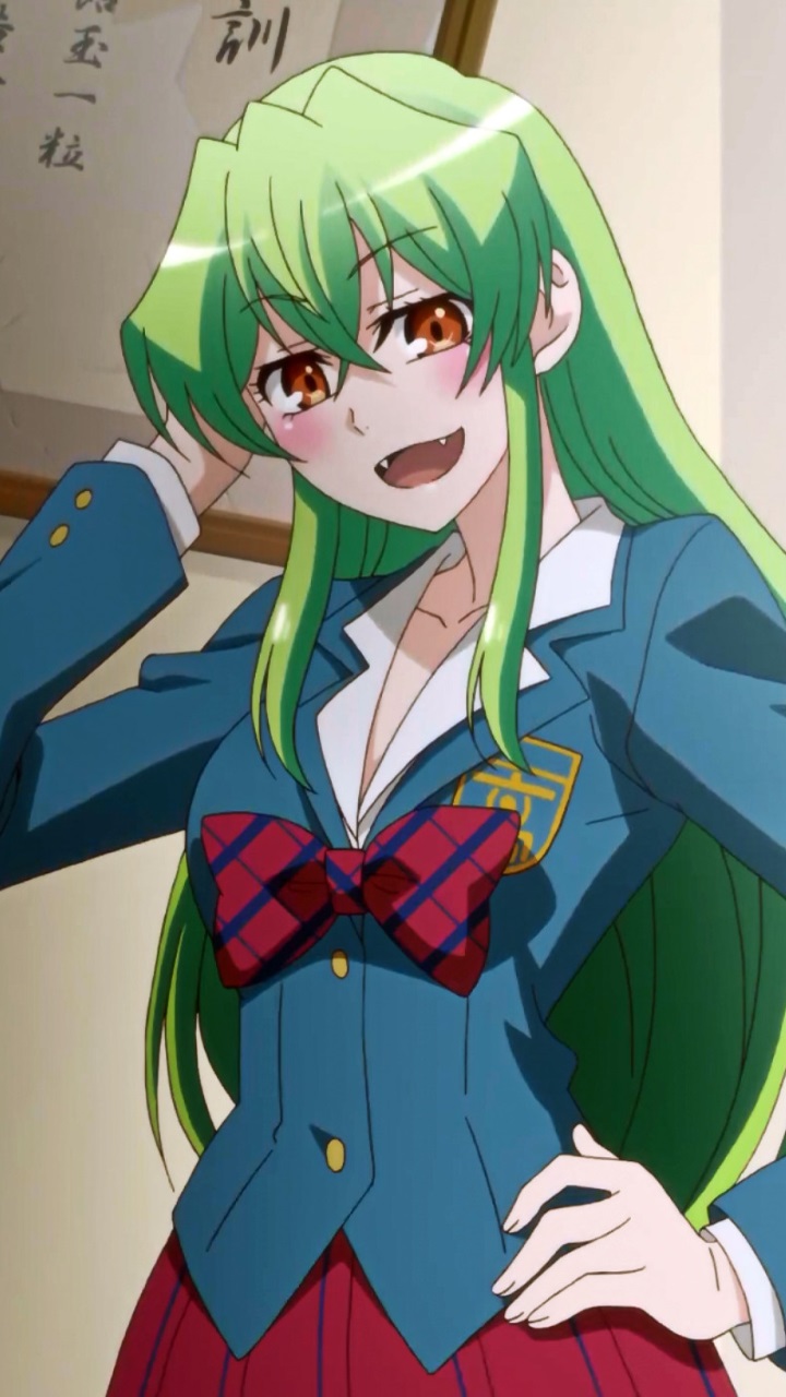 Description: A woman with green hair and a bow tie in a room with a sign on the wall behind her.