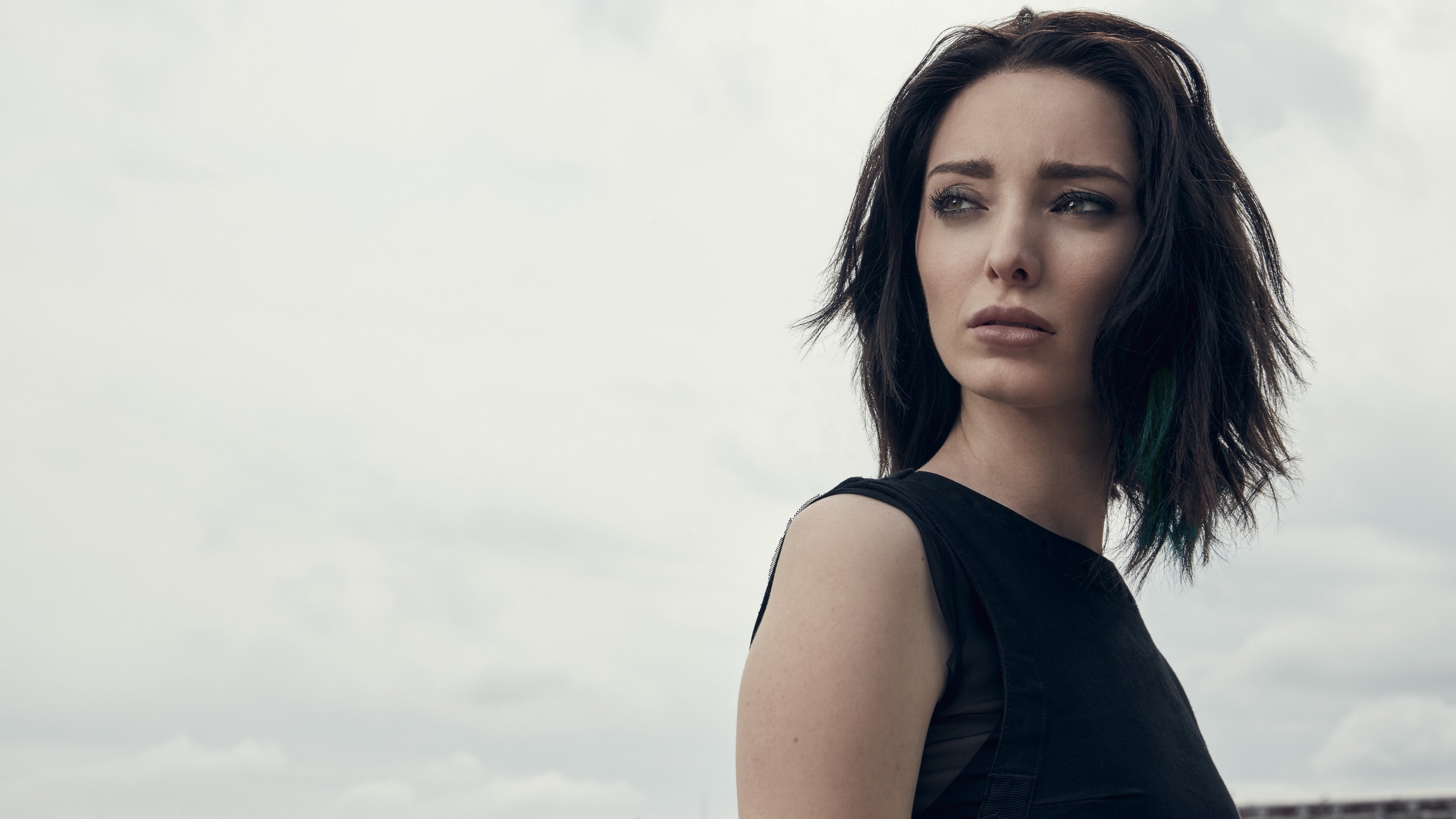 Description: A woman with a black top and green hair looking at the camera with a cloudy sky in the background.