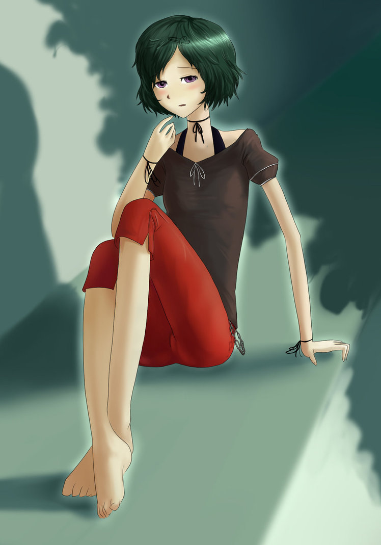 Description: A woman with green hair sitting on the ground in a black shirt and red pants and a black shirt.